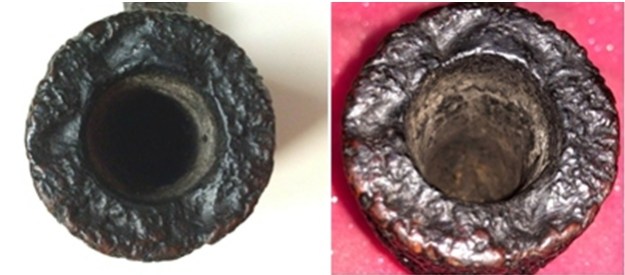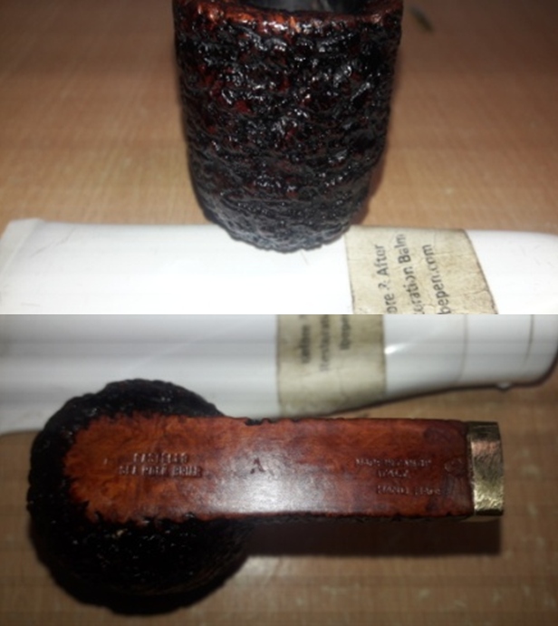 This pipe has a large bowl with a depth of 2 ¾ inch. The chamber has an even layer of thick hard cake. There is a heavy overflow of lava over the rim top surface. The rim top has darkened considerably. The condition of the inner walls of the chamber and the inner edge can be commented upon after the cake has been taken down to the bare briar. The ghost smells in the chamber are not very strong.