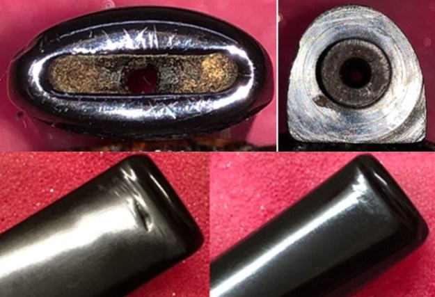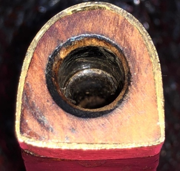 The high quality Lucite stem is nice and shiny. Some minor tooth chatter and a couple of deeper bite marks are seen on both the upper and lower stem surfaces in the bite zone. The tenon end had accumulated oils/ tars that had dried out on the inside as well as on the outside. The horizontal slot is filled with grime that will have to be addressed.