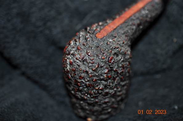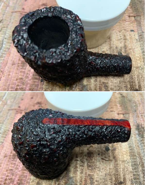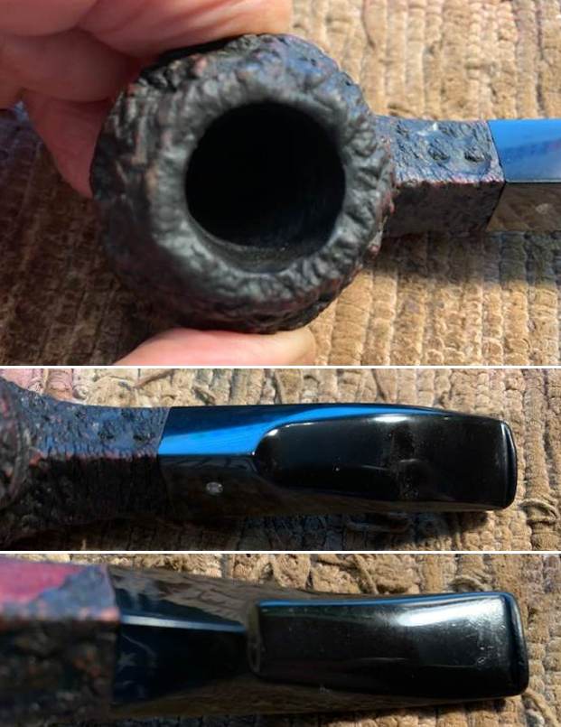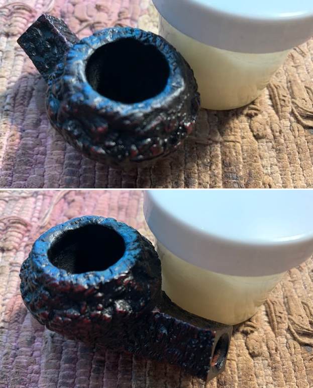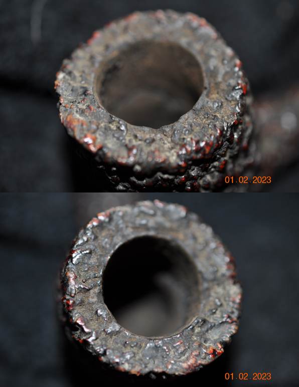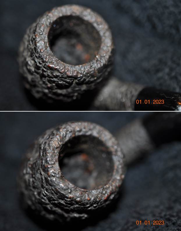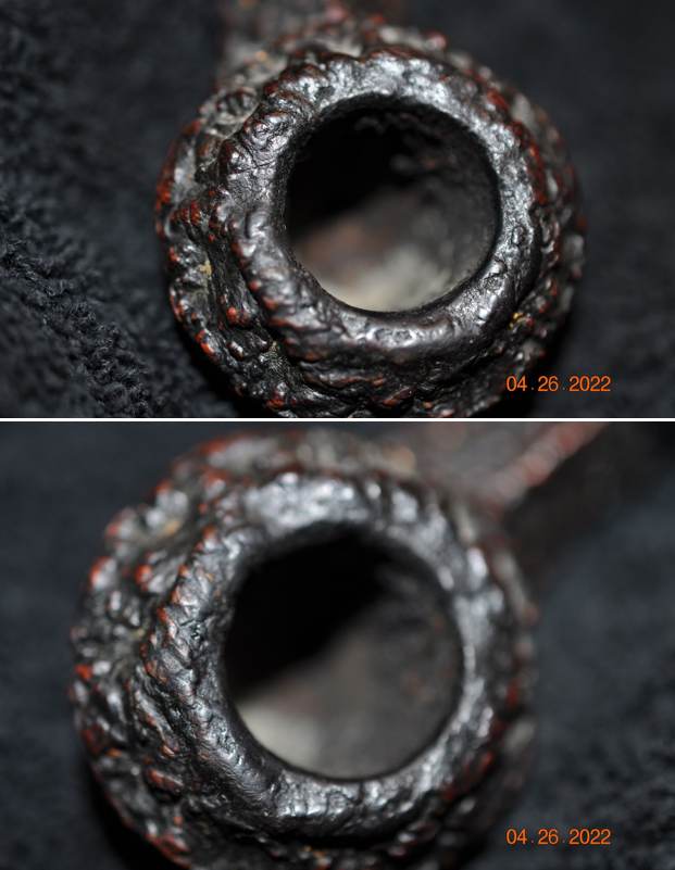 Jeff took close up photos so that I could have a clearer picture of the condition of the bowl, rim edges and top. The rim top photos confirm my assessment above. The cake in the bowl is moderate with tobacco debris stuck on the walls. The rim top has some lava, grime and debris in the rusticated surface. You can also see the condition of the outer edge and the inner edge is in great condition. This is what I look for when assessing a pipe. There is no visible burn damage at this point. The bowl is still round and other than being in a used condition it is in great shape.