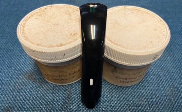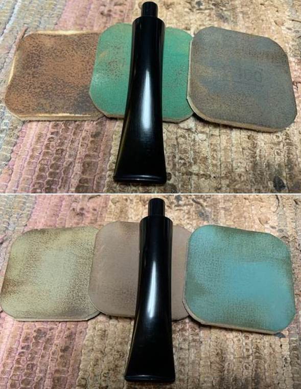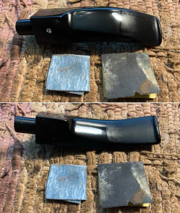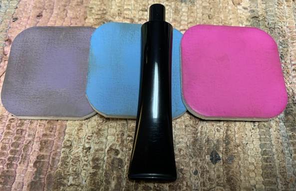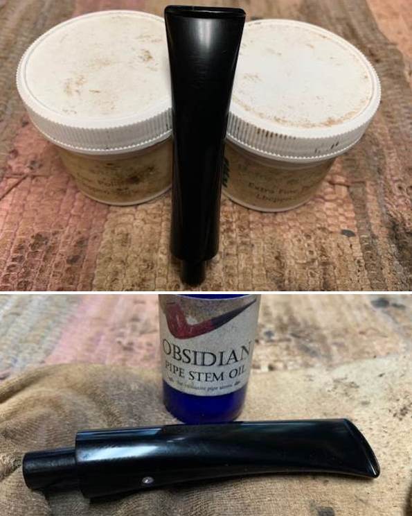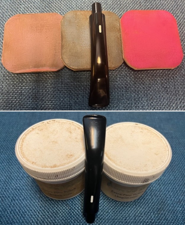 After finishing with the micromesh pads I rub the stem down with Before & After Fine and Extra Fine stem polish as it seems to really remove the fine scratches in the acrylic. I rub the Fine Polish on the stem and wipe it off with a paper towel and then repeat the process with the extra fine polish. I finish the polishing of the stem down with a final coat of Obsidian Oil and set the stem aside to let the oil absorb. This process gives the stem a shine and also a bit of protection.