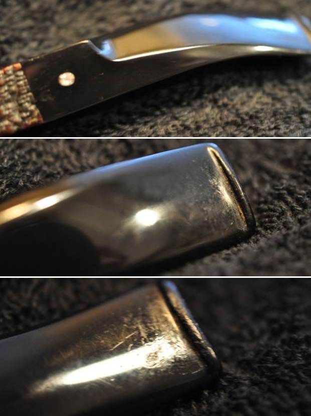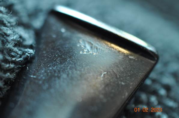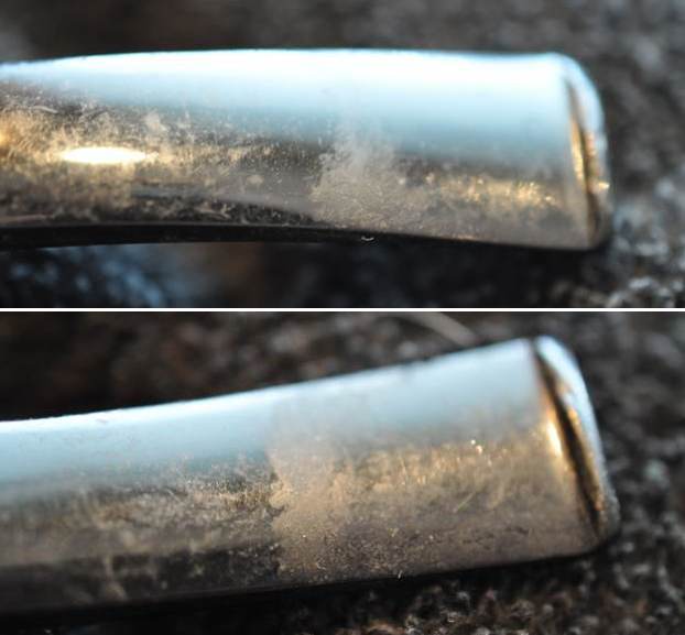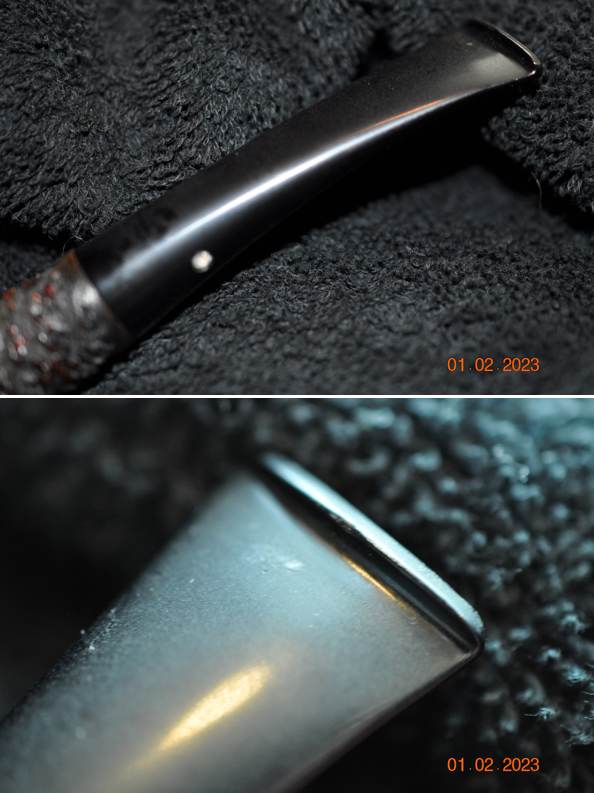 The photos of the acrylic stem surface from various angles confirmed my assessment of its condition. You can see the dirty/sticky substance on the stem in the first photo below. Fortunately the stem does not appear to have deep tooth marks – chatter yes, but no deep marks. The stem is quite dirty but otherwise undamaged.