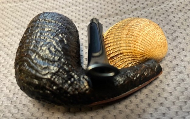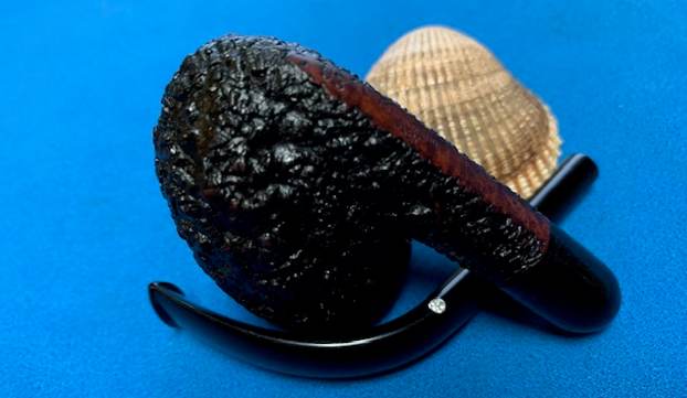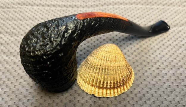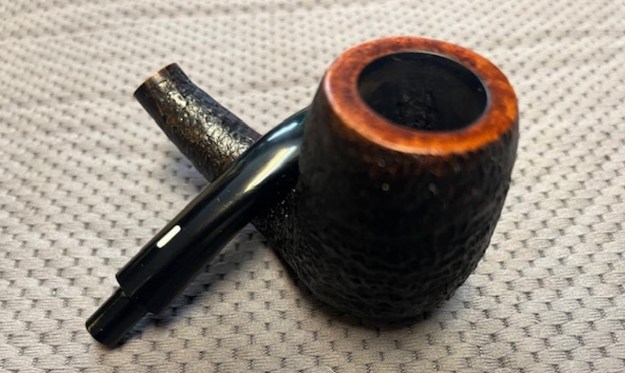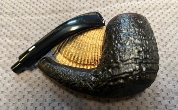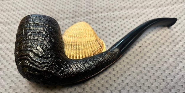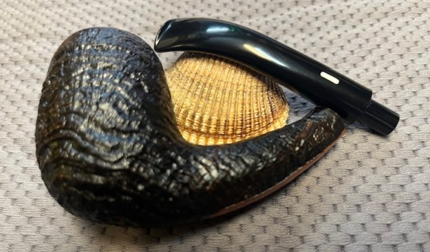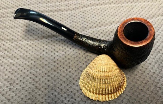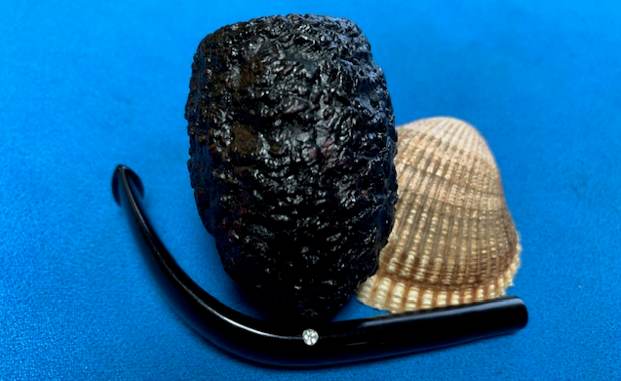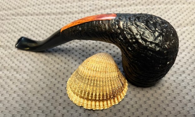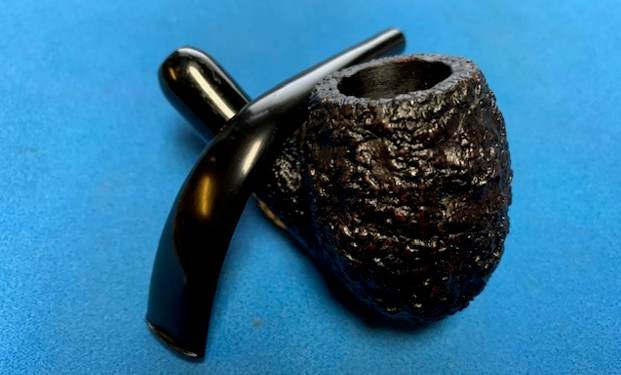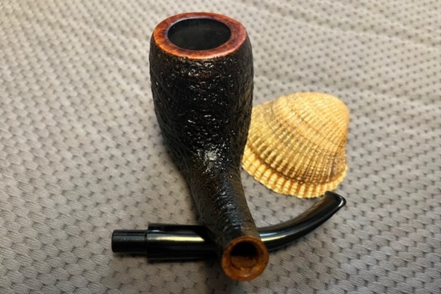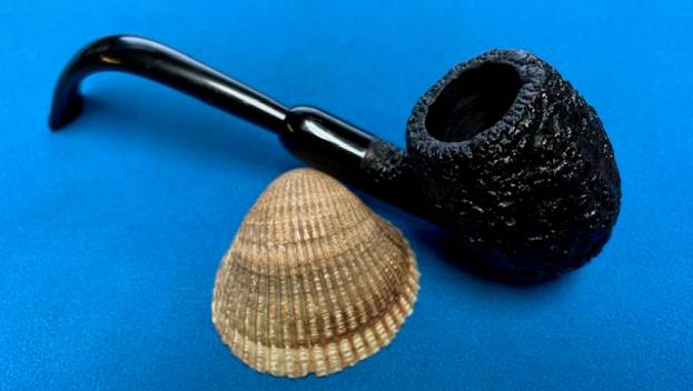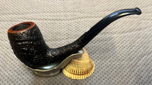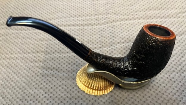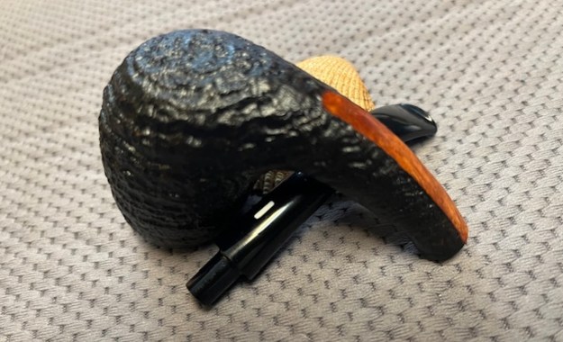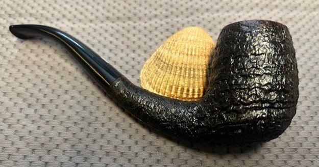 The final steps in my process involve using the buffer. I don’t buff a rusticated pipe with Blue Diamond as it can build up in the deep grooves of the finish. I used it on the stem and find that it works very well to polish out the light scratches in the acrylic. I finished with the Blue Diamond and moved on to buffing the pipe – I gave the bowl multiple coats of Conservator’s Wax and the stem multiple coats of carnauba wax. Once I have a good shine in the briar and acrylic. I have found that I can get a deeper shine if I following up the wax buff with a clean buffing pad. It works to raise the shine and then I follow that up with a hand buff with a microfiber cloth to deepen the shine. It is always fun for me to see what the polished bowl looks like with the polished acrylic stem. It really is a beautiful pipe. The rusticated finish around the bowl sides and shank has some amazing depth and contrast with the rich black and dark brown stains. Castello Sea Rock Briar 93 Bent Egg with a military bit feels great in my hand. It is light and well balanced. Have a look at it with the photos below. The dimensions are Length: 6 inches, Height: 2 inches, Outside diameter of the bowl: 1 ¼ inch, Chamber diameter: ¾ of an inch. The weight of the pipe is 1.32 ounces/41 grams. It is a beautiful pipe and a Castello shape I have been looking for to add to my own collection. I plan on loading it up and enjoying a bowl in it.