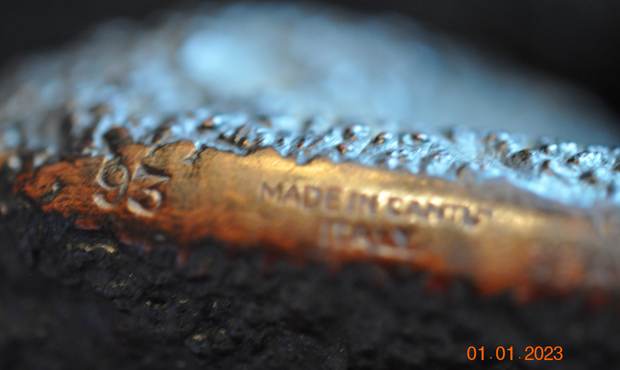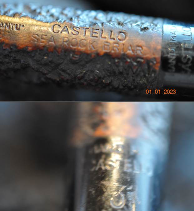 He took photos of the stamping on the underside of the shank. On the heel of the bowl is stamped the shape number 93. That is followed by the Made in Cantu [over] Italy stamp (two lines) Next that it is stamped Castello [over] Sea Rock Briar. The acrylic ferrule is stamped on the underside and reads HAND MADE [over] Castello [over] the number 3. What stands out for you in the photos of the stamping on the pipe? What do you look for in the stamping? I know it is dirty but what do you see underneath the grime on the surface of the briar and the acrylic?
