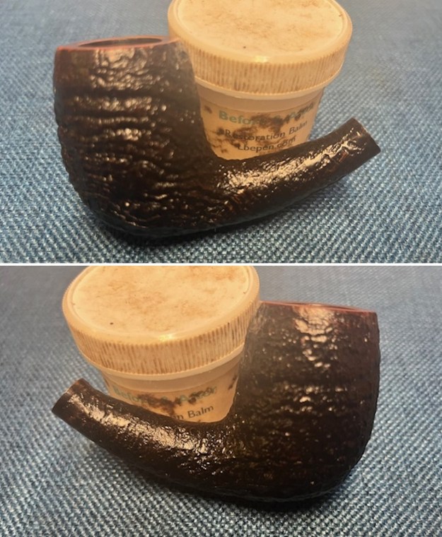 When a rusticated finish is in as nice a condition as this one is immediately apply Before & After Restoration Balm to the briar. It is a paste/balm that is rubbed into the surface of the briar and the plateau. The product works to deep clean the nooks and crannies of finish, enliven and protect the briar. I worked it into the briar with my finger tips and a horse hair shoe brush. I let it sit for 10 minutes to do its work. I wiped it off with a soft cloth then buffed it with a cotton cloth. The briar really began to have a deep shine in the briar and the grain shone through. The photos I took of the bowl at this point mark the progress in the restoration. It is a gorgeous pipe.