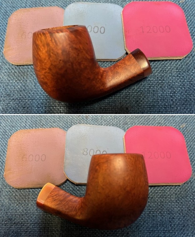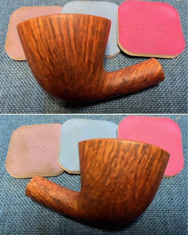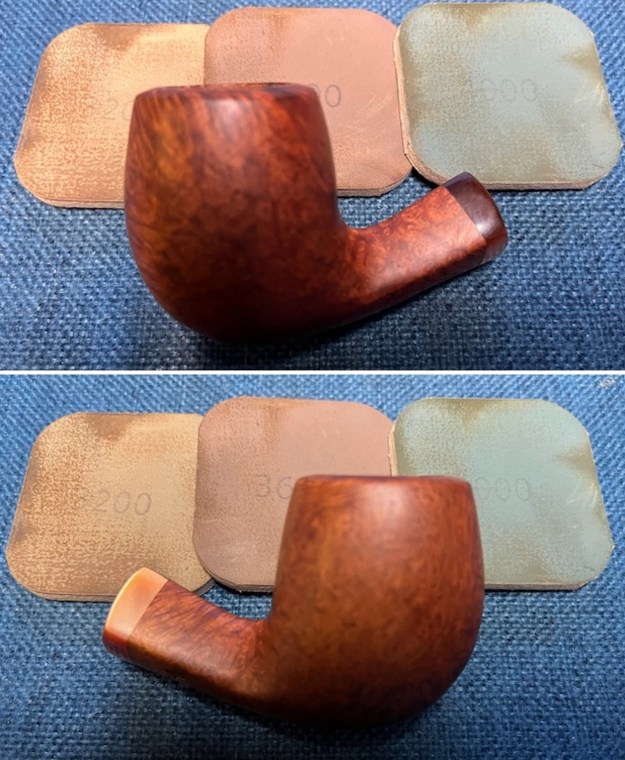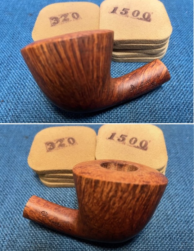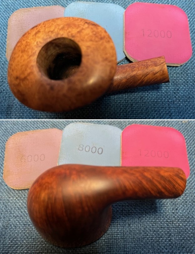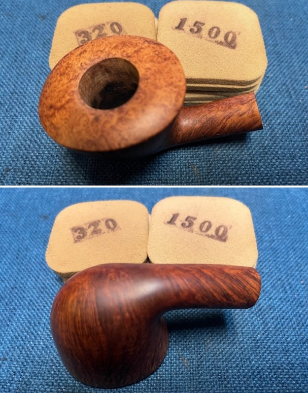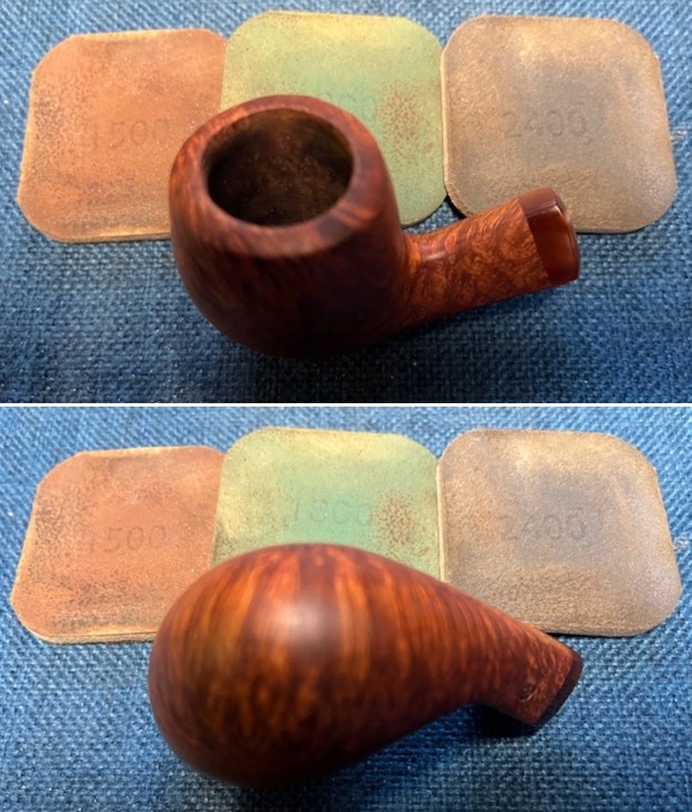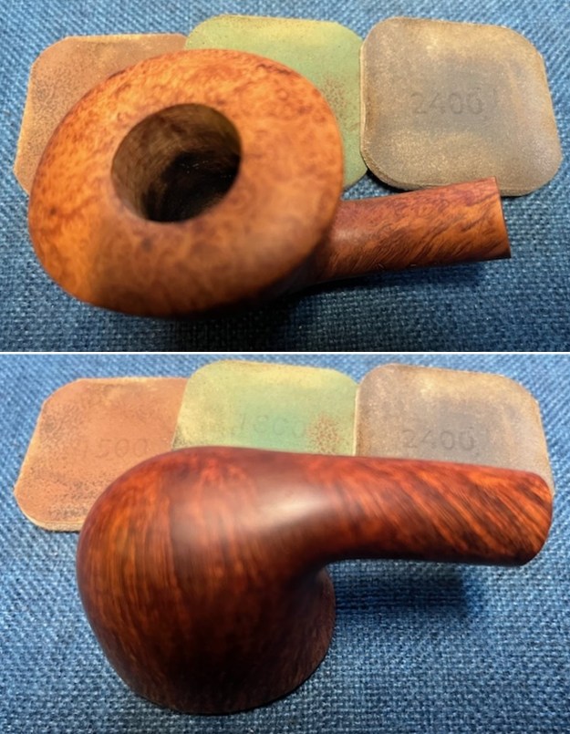 Now it was time to work on the pipe. I sanded the briar with 320-3500 grit sanding pads. I wiped the bowl down with a damp cloth after each sanding pad.