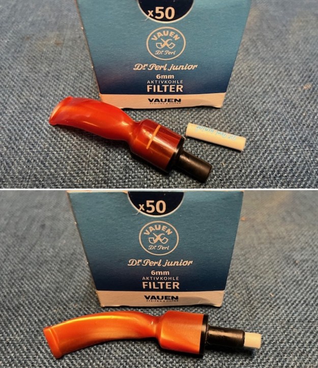 I fit the stem with a 6mm filter and put it back on the shank. It fit well but if the next pipeman wishes, the pipe could be smoked filterless though it would have a wide-open draught.