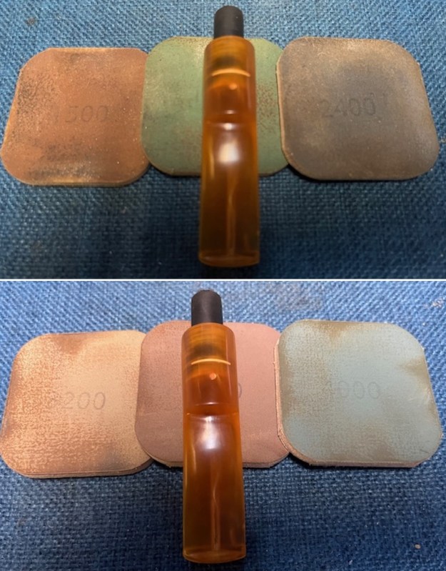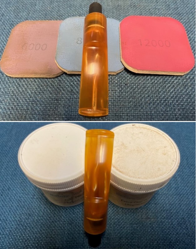 I set the bowl aside and turned my attention to the stem. I sanded the stem with 320-3500 grit sanding pads to break up the remaining oxidation. I wiped it down after each sanding pad with an Obsidian Oil impregnated cloth. It began to look good.