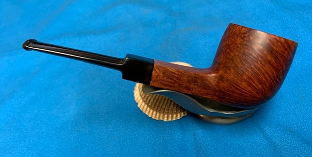 This Comoy’s Made Sunrise Tawny Grain Vintage Briar 215 Bent Billiard is a great looking pipe now that it has been restored. The brown stained finish around the bowl is quite beautiful and highlights grain very well. The finish works well with the polished vulcanite bent saddle stem. I put the stem back on the bowl and carefully buffed the pipe with Blue Diamond on the buffing wheel using a light touch on the briar. I gave the bowl and the stem multiple coats of carnauba wax on the buffing wheel and followed that by buffing the entire pipe with a clean buffing pad. I hand buffed the pipe with a microfiber cloth to deepen the shine. The finished Sunrise Tawny Grain Vintage Briar Bent Billiard sits nicely in the hand and feels great. Give the finished pipe a look in the photos below. The dimensions of the pipe are Length: 5 inches, Height: 1 ¾ inches, Outside diameter of the bowl: 1 ¼ inches, Chamber diameter: ¾ inch. The weight of the pipe is 56 grams/1.98 ounces. I will be putting it on the rebornpipes store shortly. If you are interested in adding this pipe to your collection send me a message or an email. Thanks for reading this blog and my reflections on the pipe while I worked on it. There are many more to come!