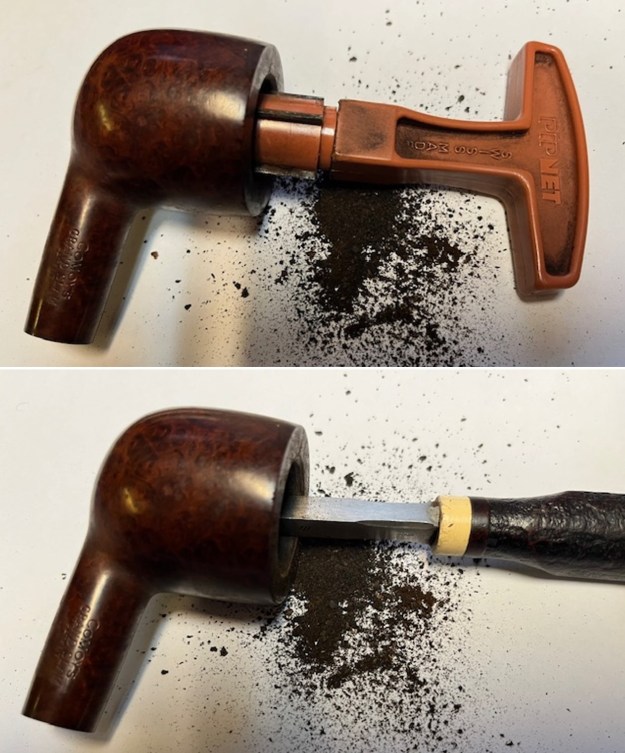 As the stem was (nearly) complete, I moved on to the stummel. The first step was to ream out the bowl – that is to say, remove all the cake inside the bowl. This accomplished a couple of things. First (and most obviously), it cleaned the bowl and provided a refurbished chamber for future smoking. Second, when the old cake was removed, I could inspect the interior walls of the bowl and determine if there was damage or not. I used a couple of reamers, a pipe knife, and a piece of sandpaper taped to a wooden dowel. Collectively, these ensured that all the debris was removed. Humorously, the cake in the bowl was so hard, that I actually got a blister on my hand from cranking the reamer.