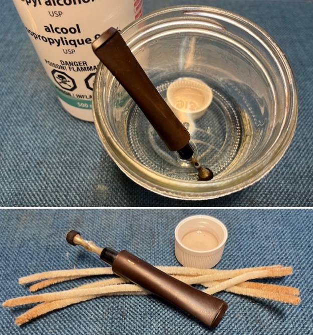 The primary cleaning came next. I disinfected the inside of the stem with both pipe cleaners and cotton swabs dipped in lemon-infused 99% isopropyl alcohol. I scrubbed thoroughly to make sure the interior was very clean. Boy, was it dirty! I used many pipe cleaners and cotton swabs.