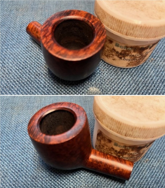 To tidy up the briar, I wiped down the outside, using a solution of a pH-neutral detergent and distilled water, with cotton rounds. This did a good job of cleaning any latent dirt on the surface of the briar. However, it also revealed a mild burn on the underside of the bowl. We’ll come back to that in a moment.