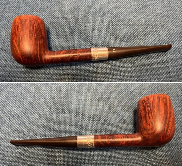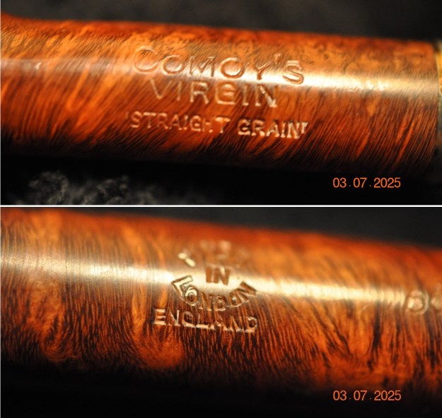 The three-piece “C” on the stem also dates from the 1950s onwards and was discontinued in the early 1980s, when Cadogan took over. So we know this pipe is before the Cadogan era. We are left with a date range of the 1950s to the 1970s. I am making an assumption that because this pipe corresponds to the first stamping variant listed in the guide, it is of an earlier part of that range. However, I have reason to make that assumption. I looked at Greg Pease’s writeup on Comoy’s and his dating information is basically the same as the Pipedia stuff above. Pease, however, adds this important tidbit: