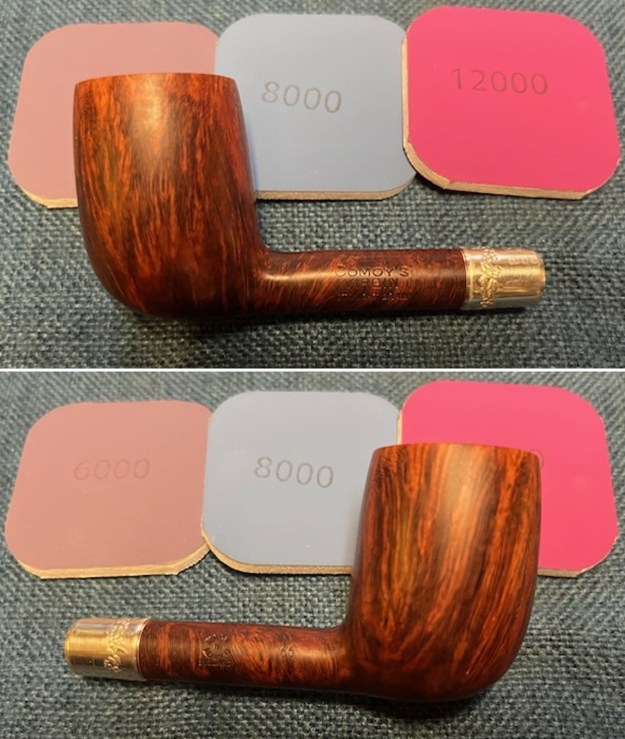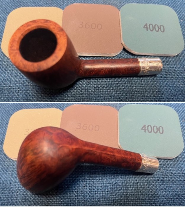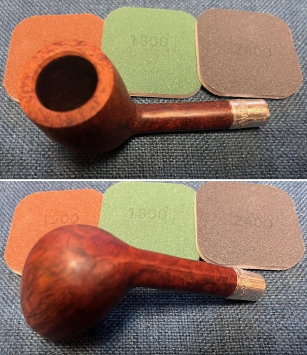 The damage to the rim was significant. In order to lessen the burns and nicks on the rim, I ‘topped’ the pipe – that is to say, I gently and evenly sanded the rim on a piece of 400-grit sandpaper. This effectively minimized the damage, without altering the look of the pipe.