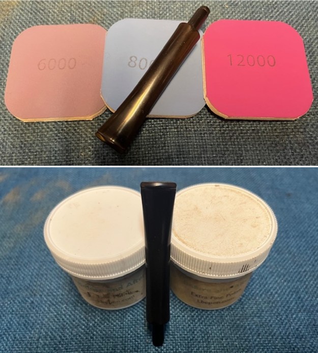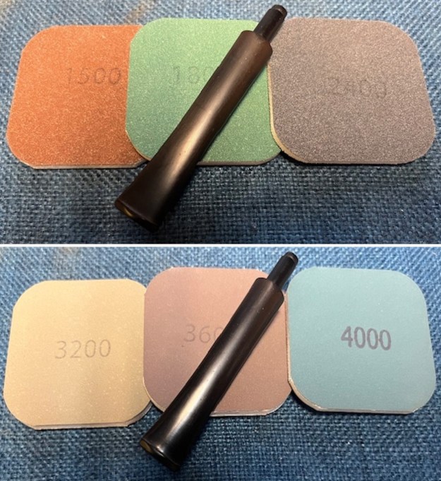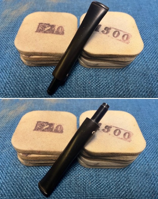 The penultimate step for the stem is sanding. First, with my set of needle files, I reduced the bulk of the cyanoacrylate repairs. I removed the excess adhesive as near to the surface as possible, without cutting into the vulcanite. Following that, I used all nine of the micromesh sanding pads (1,500 through 12,000 grit) to sand out flaws, even out the vulcanite, and provide gentle polishing of the finished surface. I also applied pipe-stem oil while using the last five micromesh pads. There was a wonderful, deep black shine to the stem when I was done.