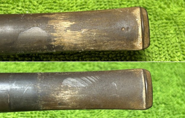 My next step was to remove the lava on the rim. For this, I took a piece of machine steel and gently scraped the lava away. The metal’s edge is sharp enough to remove what I need, but not so sharp that it damages the rim. This work revealed that there was some notably burn marks and a few more nicks. Too bad, but no problem to restore.