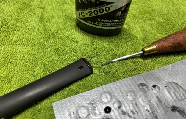 As the stem was now clean and dry, I set about fixing the marks and dents in the vulcanite. This was done by filling those divots with black cyanoacrylate adhesive, impregnated with carbon and rubber. I left this to cure and moved on.