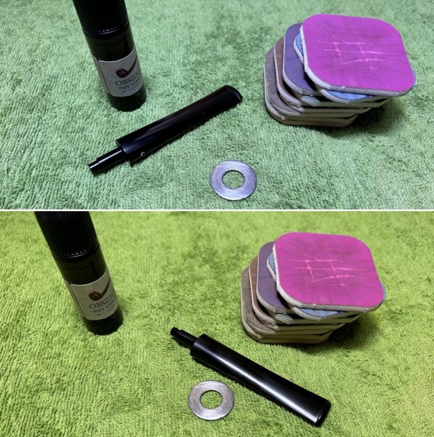 I used a disposable lighter and ‘painted’ the stem with its flame. The gentle heat of the flame can cause the dents in the vulcanite of the stem to expand back into shape. In this case, next-to-nothing happened. Alas. The stem’s calcification was quite substantial. I used an old butter knife and gently scraped some of the thicker accretion off. Doing this now helps later in removing the oxidation. I used alcohol on a few cotton rounds and wiped down the stem to provide an initial cleaning of filth before moving on to the next steps.