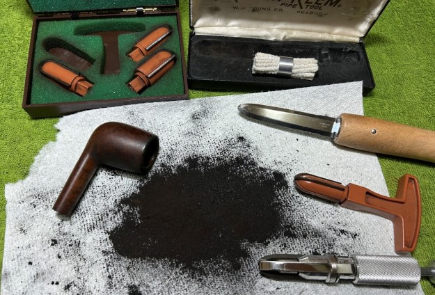 As the stem was (nearly) complete, I moved on to the stummel. The first step was to ream out the bowl – that is to say, remove all the cake inside the bowl. This accomplished a couple of things. First (and most obviously), it cleaned the bowl and provided a refurbished chamber for future smoking. Second, when the old cake was removed, I could inspect the interior walls of the bowl and determine if there was damage or not. I used a couple of reamers, a pipe knife, and a piece of sandpaper taped to a wooden dowel. Collectively, these ensured that all the debris was removed. Humorously, the cake in the bowl was so hard, that I actually got a blister on my hand from cranking the reamer.