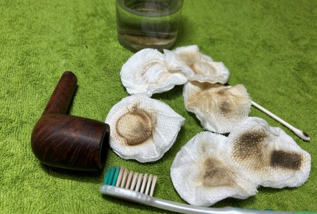To tidy up the briar, I wiped down the outside, using a solution of a pH-neutral detergent and distilled water, with cotton rounds. This did a good job of cleaning any latent dirt on the surface of the briar. However, it also revealed a mild burn on the underside of the bowl. We’ll come back to that in a moment.