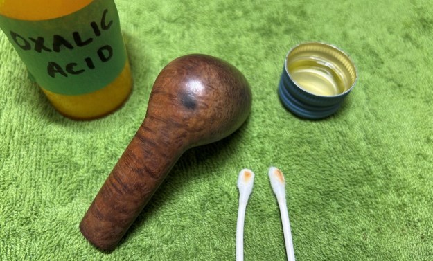 To deal with the burn, I took some crystalized oxalic acid and dissolved it in warm water. I used some cotton swaps, dipped in the solution, and rubbed the burned spot vigorously. The weak acid works very nicely to alleviate superficial burns (burns where the integrity of the wood is still sound). The burn is quite superficial and the solution did work a bit, but the burn will remain as part of the pipe’s history.