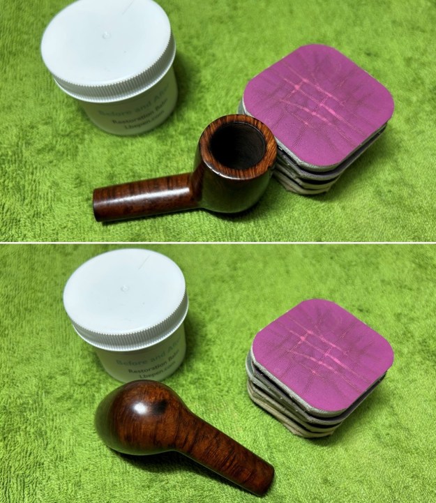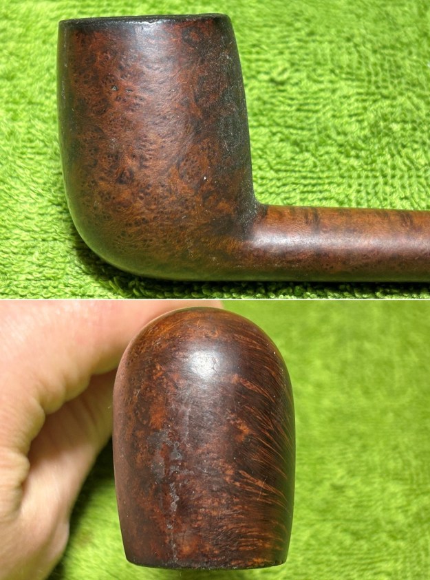 The damage to the rim was significant. In order to lessen the burns and nicks on the rim, I ‘topped’ the pipe – that is to say, I gently and evenly sanded the rim on a piece of 400-grit sandpaper. This effectively minimized the damage, without altering the look of the pipe.