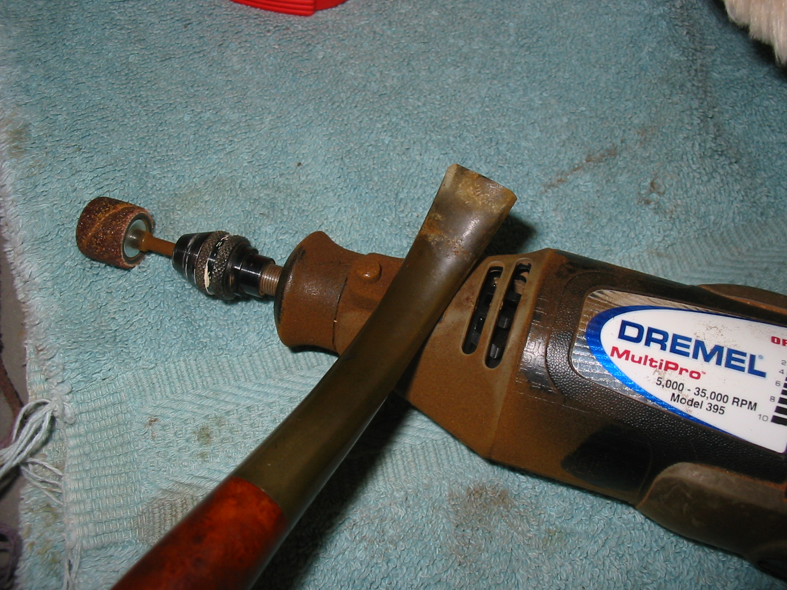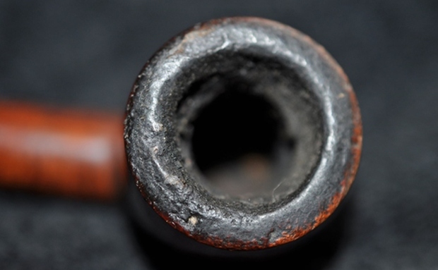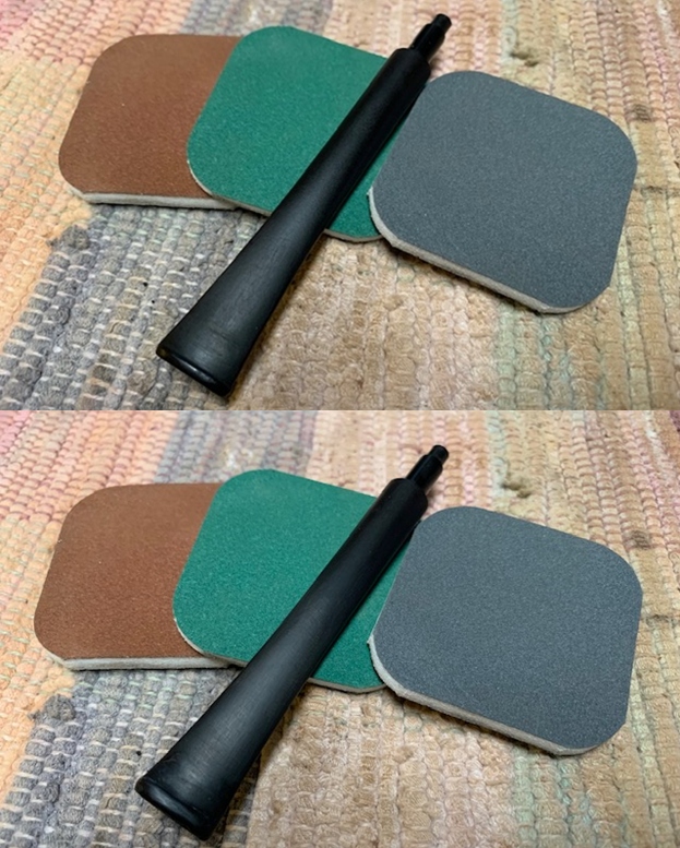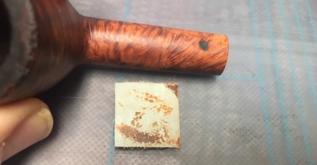 I started my work on the pipe by addressing the damage on the rim top, outer edge and the inner beveled edge of the bowl. I topped the bowl on a topping board with 220 grit sandpaper. I filled in the deep damage on the outer edge and rim top with clear super glue and briar dust. I used a wooden ball and 220 grit sandpaper to give the rim top and inner edge a bevel and minimize the burn damage to the top and edges.