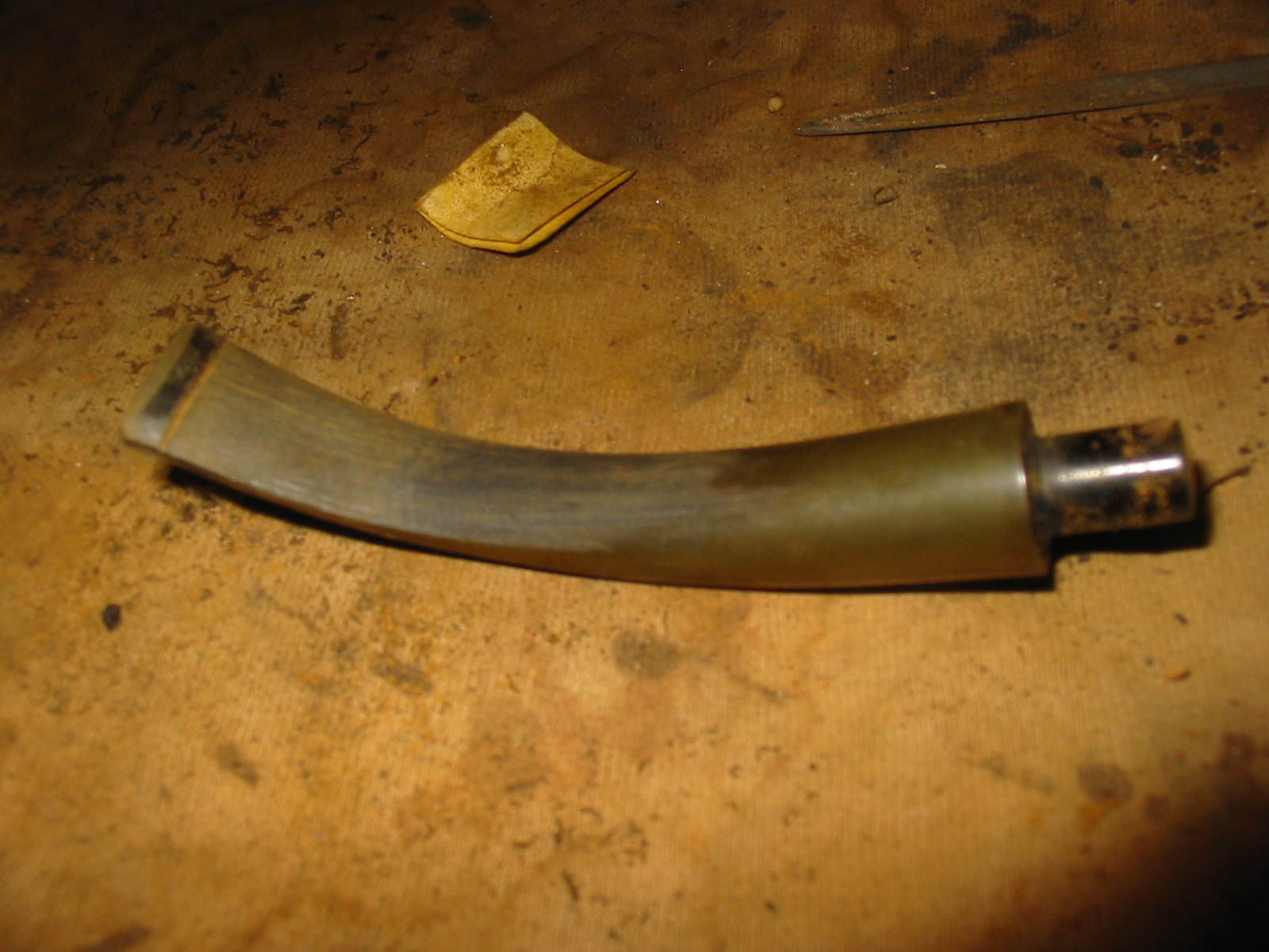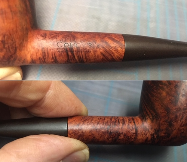 Jeff and I know longer remember where or when we purchased this pipe. It is a small pipe with nice grain and a saddle stem. It is stamped on the left side of the shank and reads COMOY’S [over] TRADITION. The right side is very faintly stamped Made in England. The rest of the stamp was unclear as was the shape number. It had a flat bottom on the shank and heal of the bowl that made it a sitter. We don’t have any photos of the pipe before Jeff cleaned it. But Jeff did his usual cleanup. The bowl was reamed with a PipNet reamer. He cleaned it up with a Savinelli Fitsall Pipe Knife. He scrubbed the internals with alcohol, pipe cleaners and cotton swabs. He did the same with the airway in the stem. The rim top and the beveled inner rim edge were damaged and showed burn marks on the front and back of the bowl. The outer edge of the bowl was damaged on the front side. The bowl was also out of round and damaged. The vulcanite saddle stem is clean but has some tooth marks on the top and underside ahead of the button. The stem has a 3 part C on the left side of the saddle. I took some photos of the pipe before I started my work on it.