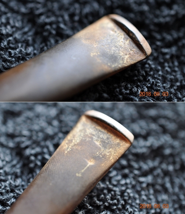 I took photos of the bowl and rim top to show the condition of both. The bowl is very clean but you can see the burn damage on the top front and rear of the bowl and on the beveled inner edge. There was some darkening all over the rim top. It really was quite a mess. I took photos of the stem as well to show the tooth dents on the top and underside ahead of the button and on the button surface as well. There was three part C logo on the left side of the saddle.