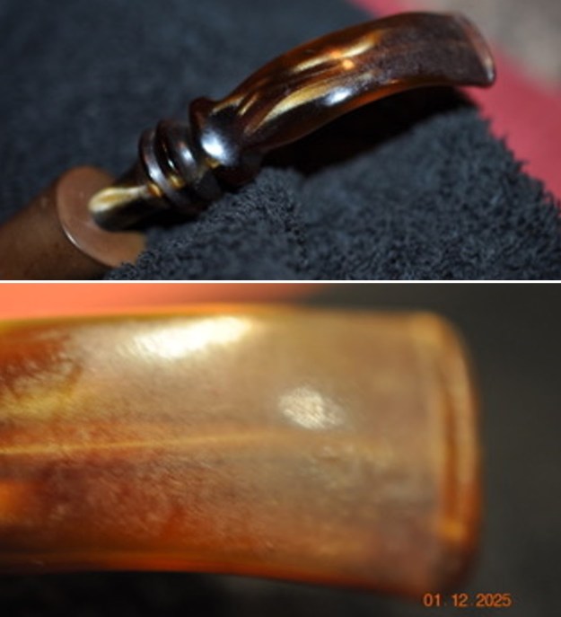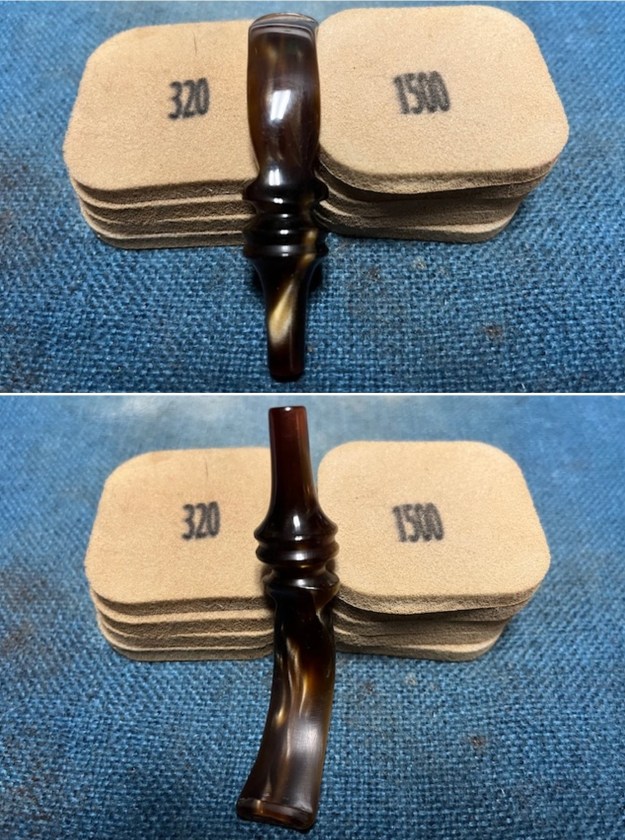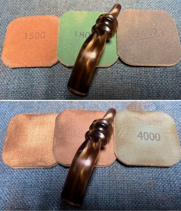 I sanded the stem and tenon surface with 320-3500 grit 2×2 inch pads. I wiped the stem down with an Obsidian Oil cloth after each sanding pad.