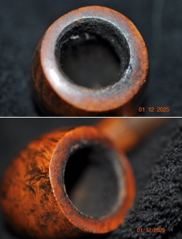 I took photos of the bowl and rim top to show the thickness of the cake and the lava coat on the rim top. There was some tobacco debris in the bottom of the bowl. The stem photos show the condition of the taper stem ahead of the button.