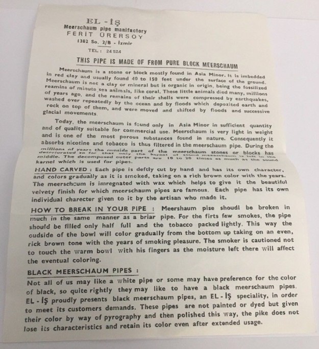 I thought I would include the information from the leaflet that is in each box. It is helpful information on the brand and the meerschaum. I have left out the address on the leaflet as I have included it above. I quote: