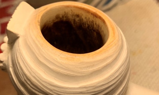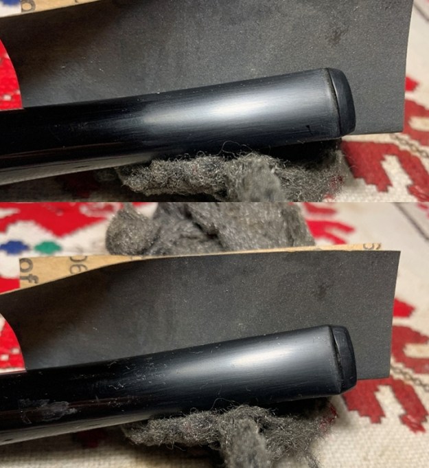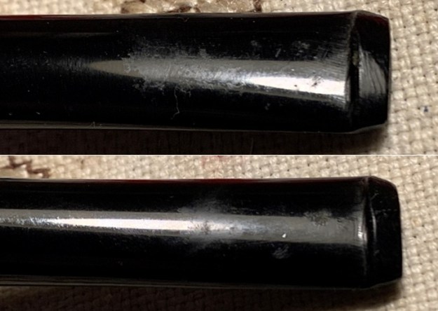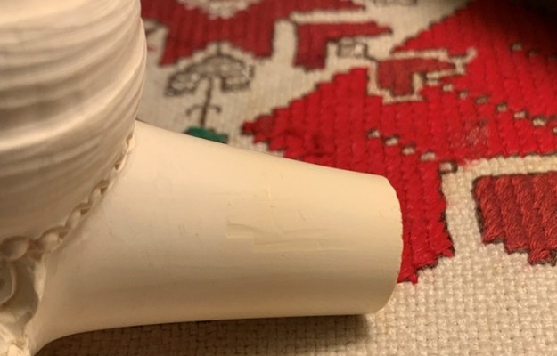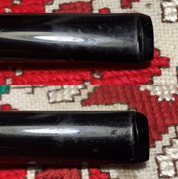 I set the bowl aside and turned my attention to the stem. There was a deep tooth divot on the underside of the stem ahead of the button. I filled it in with clear CA glue. Once it cured I sanded it smooth with 220 grit sandpaper.
