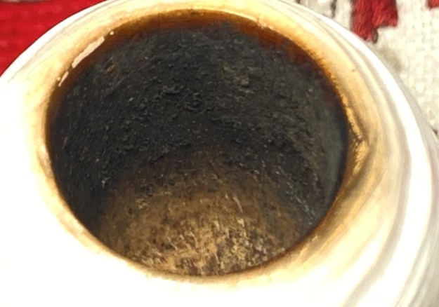 When I examined it, I noticed a light build up of lava on the rim top. Because of the colour of the meer it is more noticeable to touch than sight. It is a dullness to site. When I was touching it I also felt the inner edge and noticed there was a light cake in the bowl and some tobacco debris. The stem had some darkening in the button area and in the first inch of the airway. There were light tooth marks and chatter on the stem surface. But I knew I would need to give this pipe a good cleaning. I removed the stem to give a sense of the parts and to showing the staining on the bone tenon.
