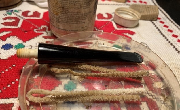 We purchased two of these El-Is Ferit Orersoy Black Meerschaum pipes from a seller in Vilas, North Carolina, USA on 12/01/23. The 2 pipes were both straight Rhodesian style pipes – one with black stem and one with yellow stem. One was smoked and one was clean and unsmoked. Both were boxed in their original cardboard box that is stamped on the top and reads El-Is [over] Ferit Orersoy [over] 1, Kordon 1382 So – 2/8 [over] Izmir. The boxes are light weight and include the original cotton piece the pipe sat on as well as a leaflet on the care of the black meerschaum. The unsmoked pipe will be looked at in the next blog but this one was smoked. It had a light cake in the bowl and some lava overflow on the rim top. The finish was a little spotty where the fingers held it. It would lessen when I cleaned and waxed it. The shank was very dirty as was the bone tenon that held the stem in place. The tenon was threaded into the shank of the pipe first and then the stem screwed onto it to allow for proper alignment. The tenon was lightly stained with tobacco as was the airway in the stem. There was some blackening at the airway’s entrance to the button slot. The pipe smelled dirty and would need to be cleaned up.