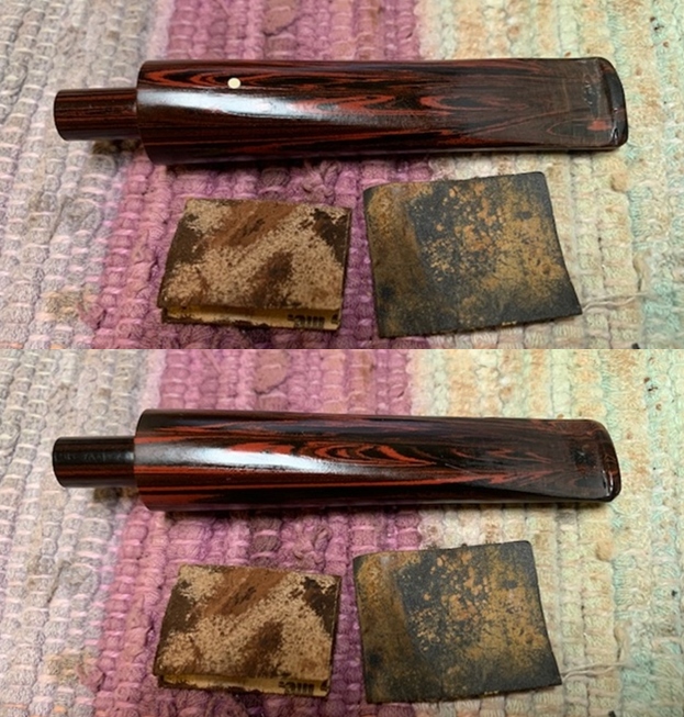 I worked over the rim top lava build up and the scratches on the walls of the bowl and shank with 320-3500 grit 2×2 inch sanding pads. I wiped the bowl down with a damp cloth after each sanding pad. The crowned smooth rim top looks good.