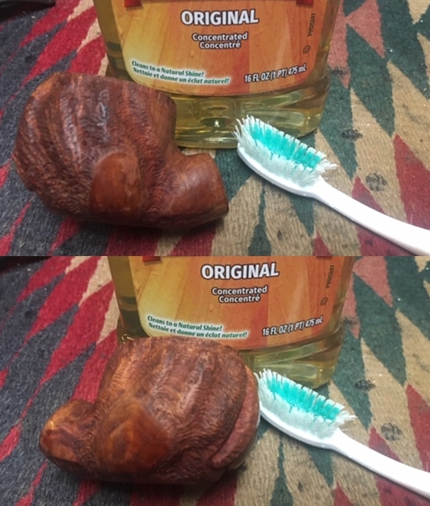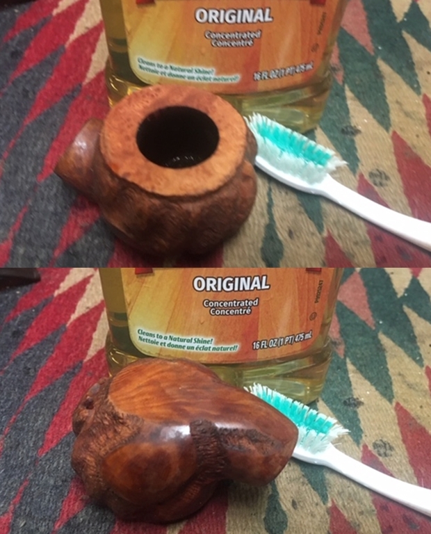 As I mentioned, my cousin-in-law already did the vast majority of the cleaning – Deo gratias. To finish tiding up the briar, I wiped down the outside with some oil soap on cotton rounds (and a toothbrush). This does a good job of cleaning any latent dirt on the surface of the briar. I then scoured the inside of the stummel with some soap and tube brushes.