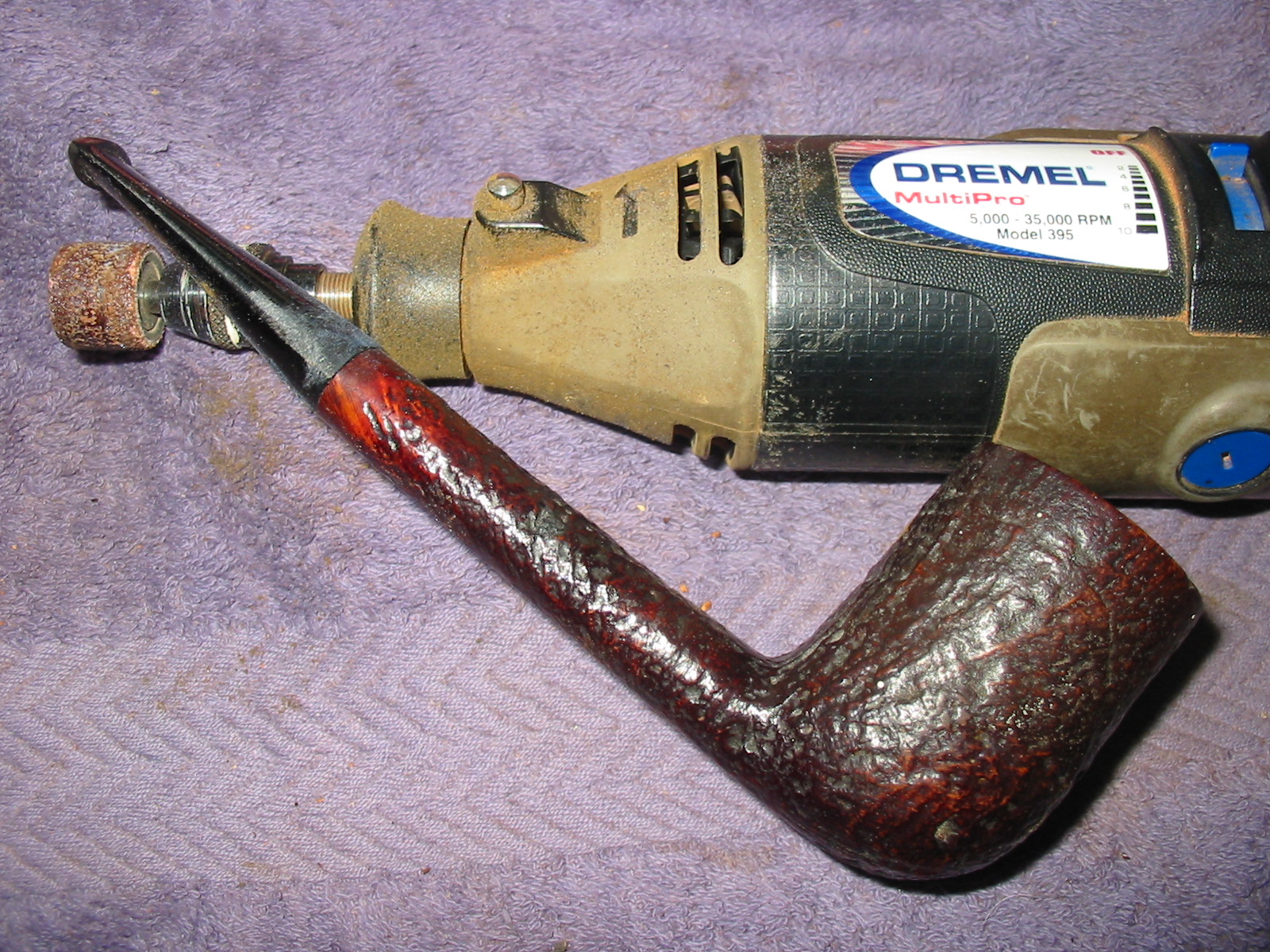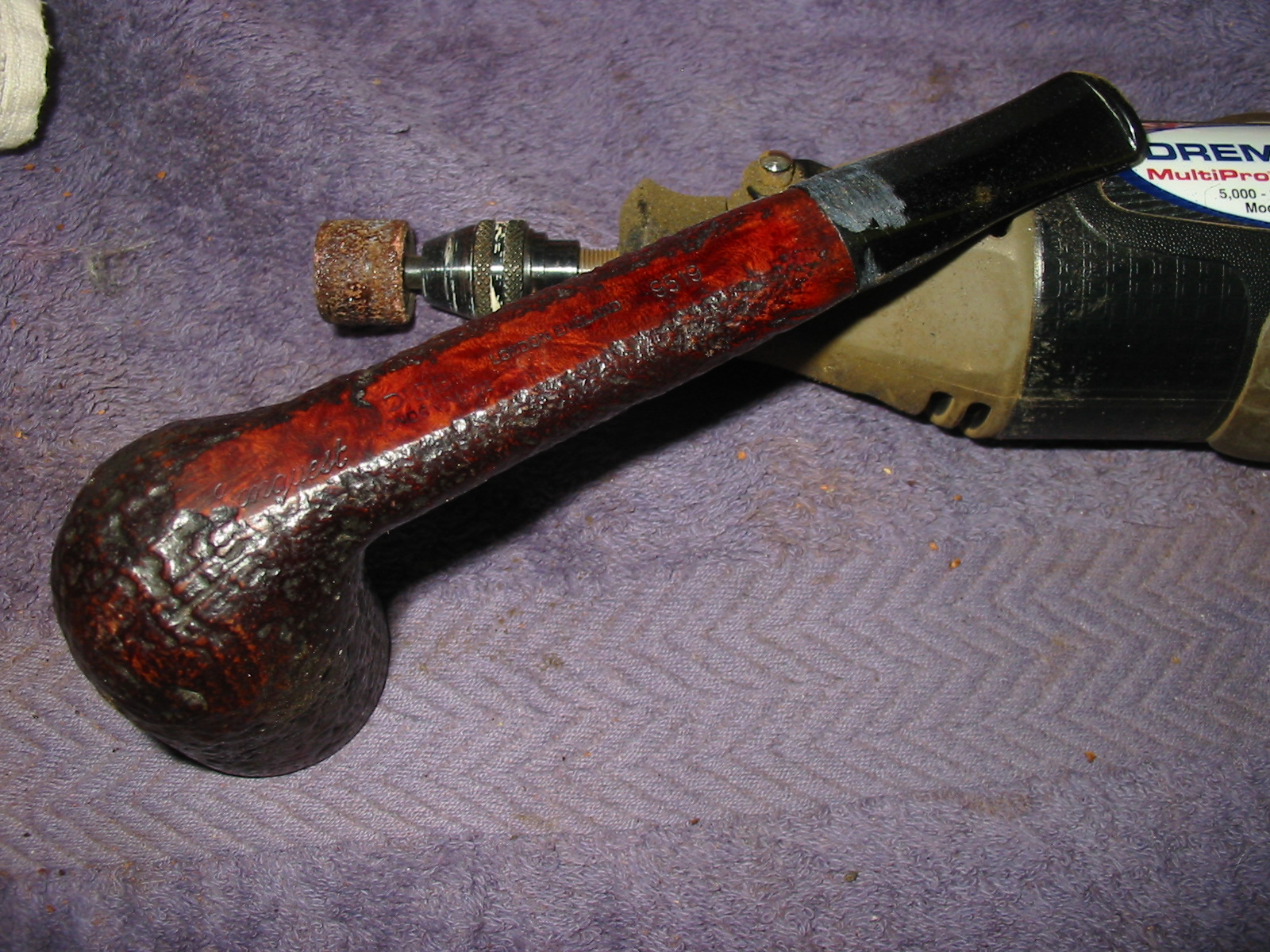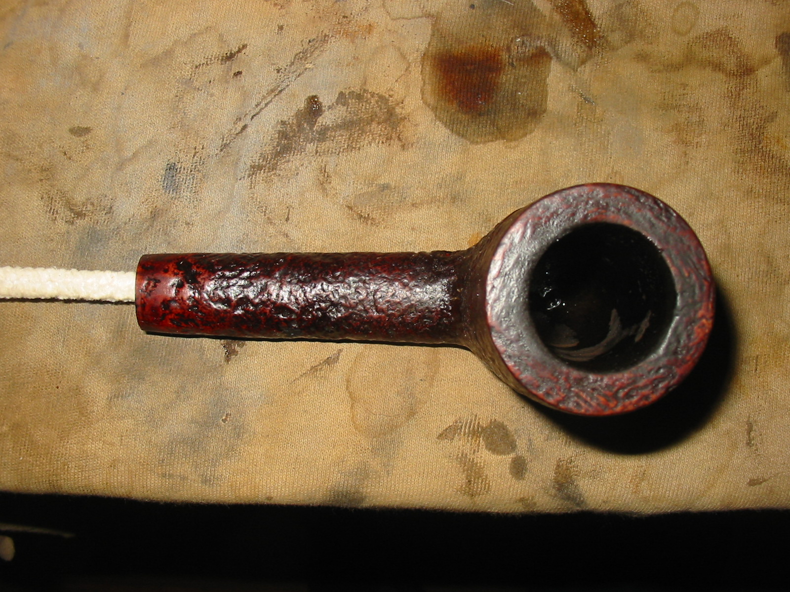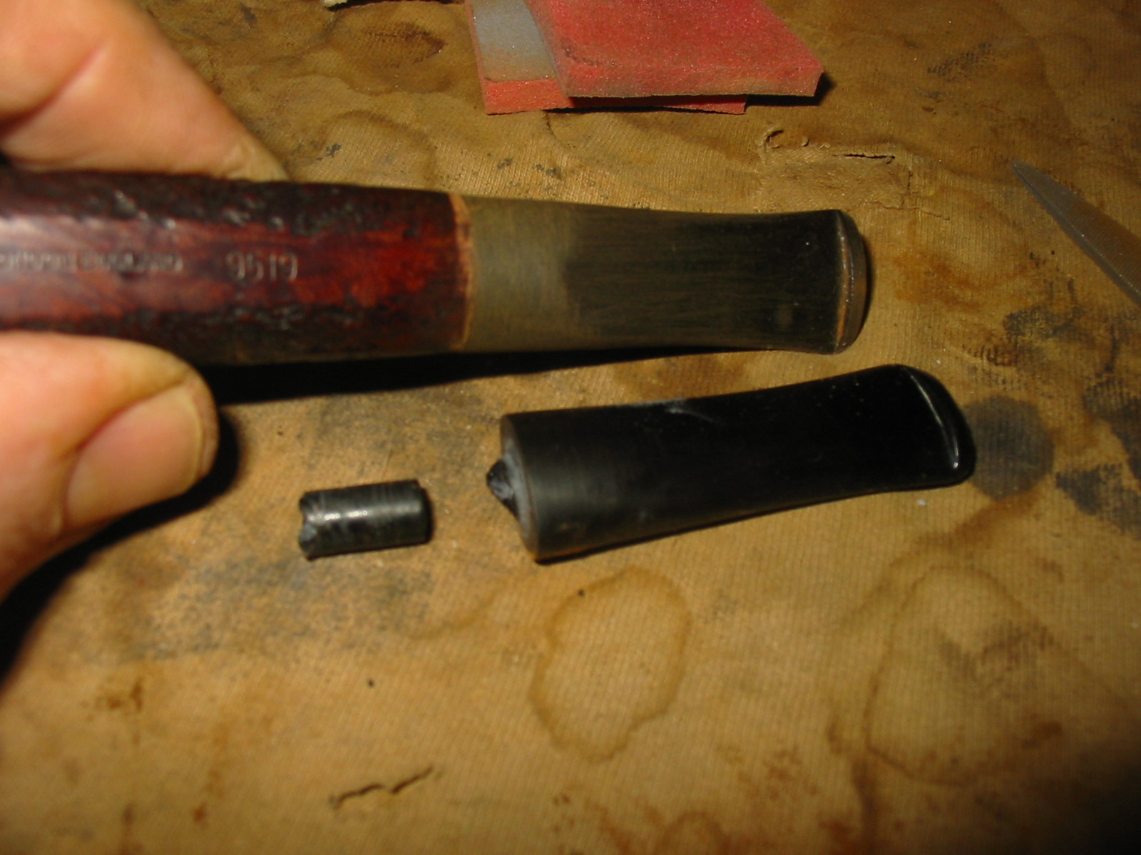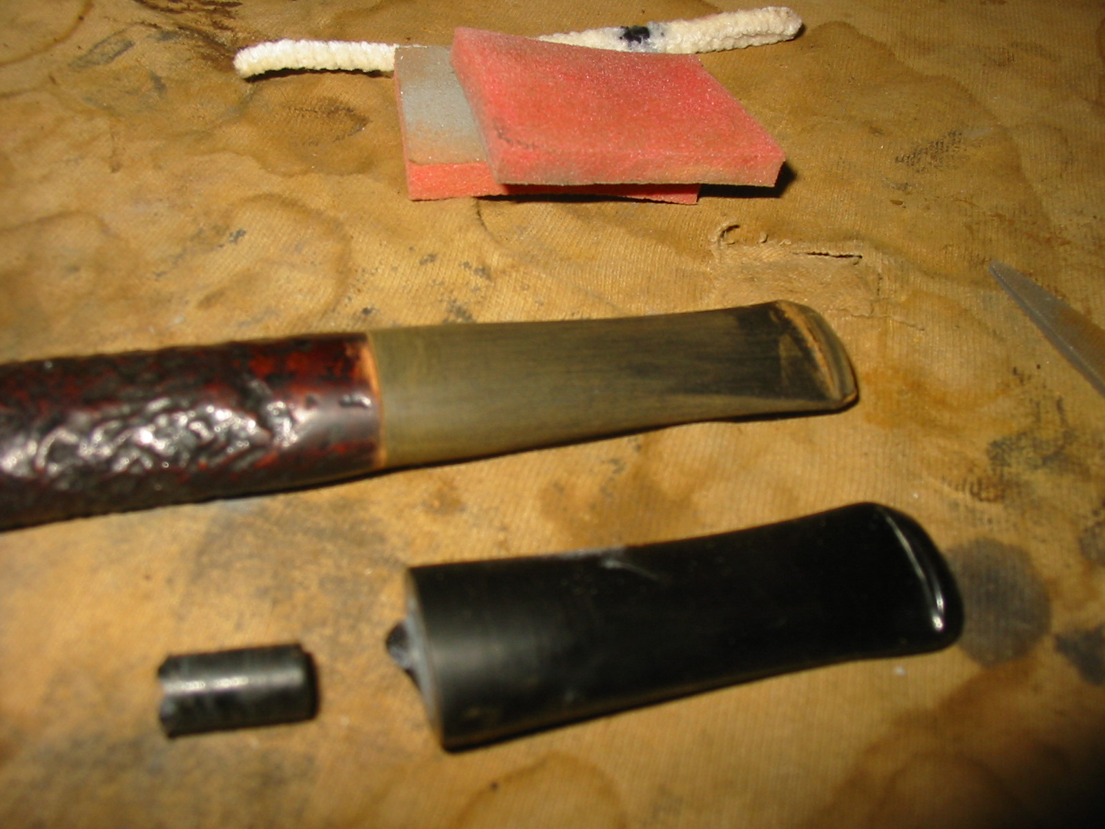 I set aside the bowl and turned my attention to the stem. I sanded out the tooth damage with 320-3500 grit sanding pads. I wiped the stem down after each pad with a damp cloth. I was able to remove the damage and the stem looked better.