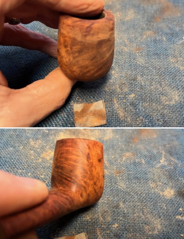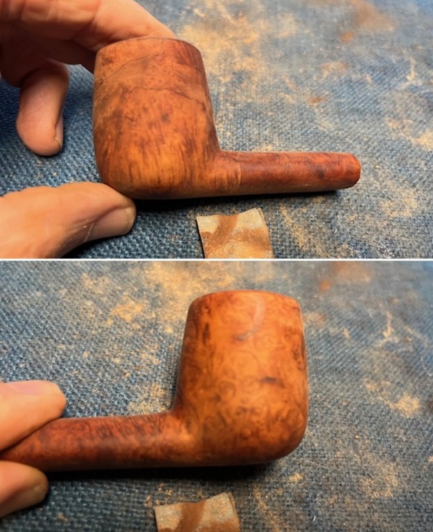 I scrubbed the bowl and shank with a tooth brush and some undiluted Murphy’s Oil Soap. I rinsed it off with warm water to remove the dust and soap from the finish. I dried it off with a soft cloth and it looked much better.
