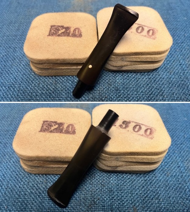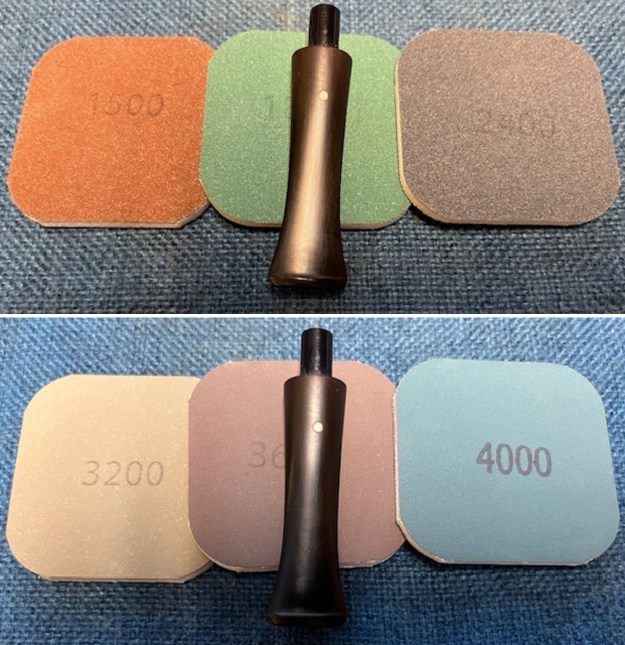 I set the bowl aside and turned to address the stem. I sanded the stem surface with 320-3500 grit 2×2 inch pads. I wiped the stem down with an Obsidian Oil cloth after each sanding pad.