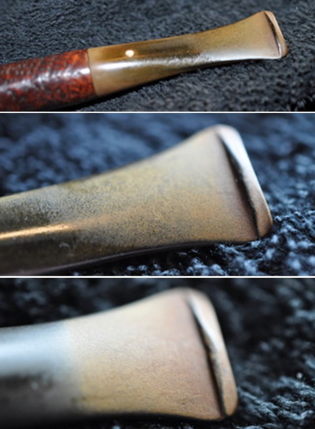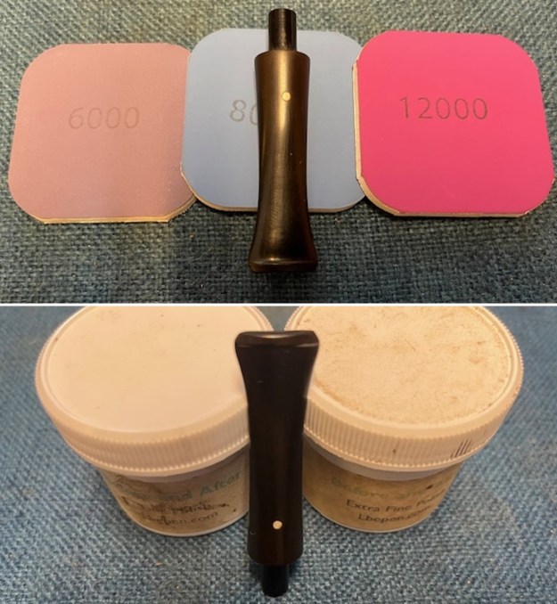 I polished the vulcanite with micromesh sanding pads – 1500-12000 grit pads. I wiped it down with Obsidian Oil after each sanding pad. I used Before & After Pipe Polish – both Fine and Extra Fine to further polish the stem.