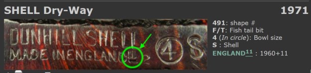 The dating chart helped me understand the date stamp 12.. I have included the chart below for you to follow (http://www.pipephil.eu/logos/en/dunhill/cledat-en1a.html). The second column is where the 12 year suffix fits. To arrive at the date the suffix is added to 1960 making the pipe a 1972 Shell Briar Spigot.
