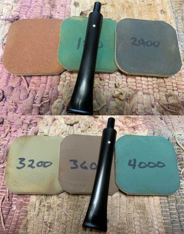 I polished the vulcanite with micromesh sanding pads – 1500-12000 grit pads. I wiped it down with Obsidian Oil after each sanding pad. I used Before & After Pipe Polish – both Fine and Extra Fine to further polish the stem.