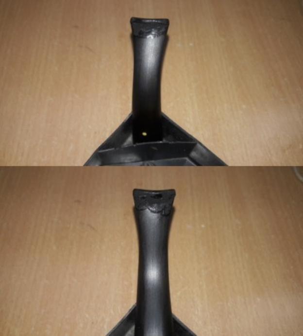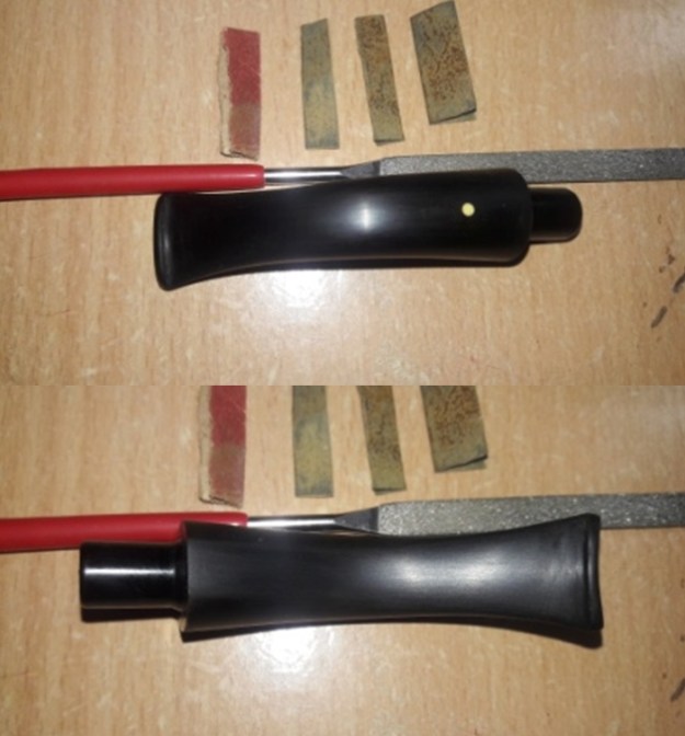 I “painted” the stem surface on both sides to lift the dents. The heat lifted the ones on the top completely and the ones on the underside for the most part. I filled in the two small remaining marks on the underside of the stem with clear CA glue. Once it cured I sanded repairs out with 220 grit sandpaper and started the polishing with 400 grit wet dry sandpaper.