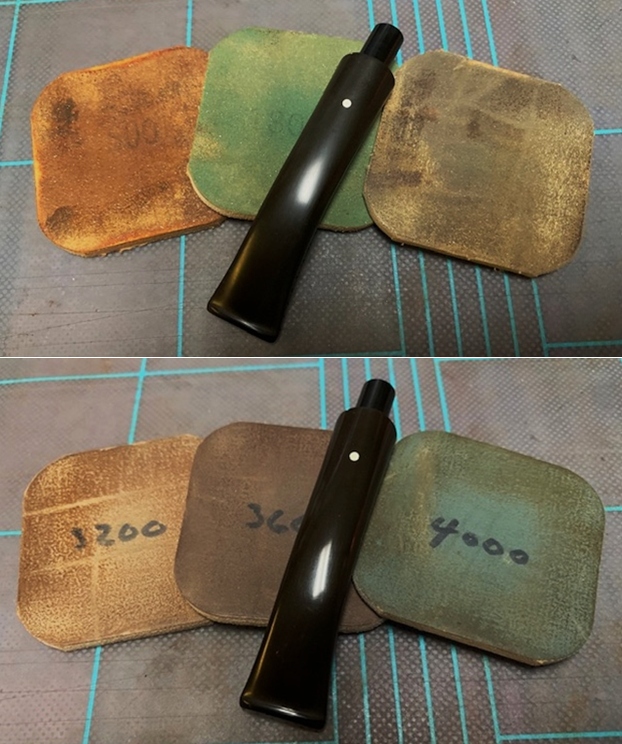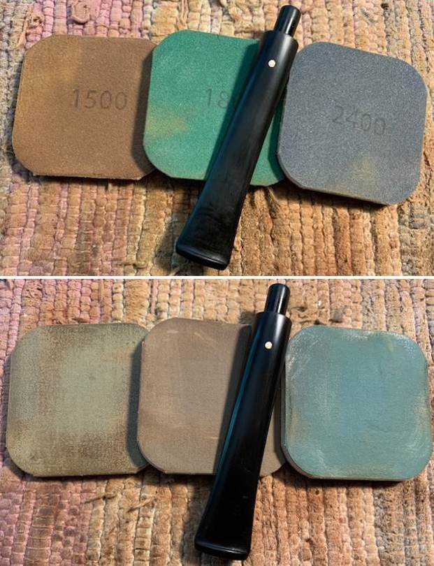I polished the vulcanite with micromesh sanding pads – 1500-12000 grit pads. I wiped it down with Obsidian Oil after each sanding pad. I used Before & After Pipe Polish – both Fine and Extra Fine to further polish the stem.