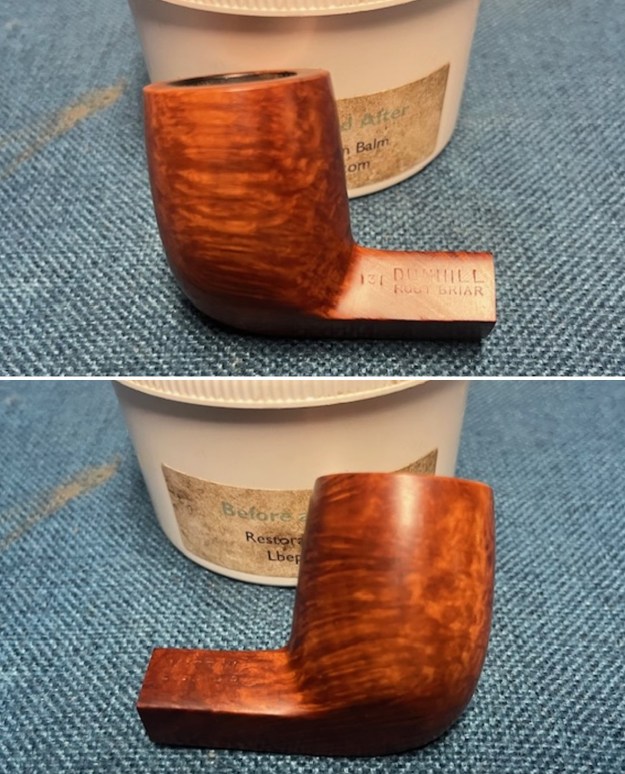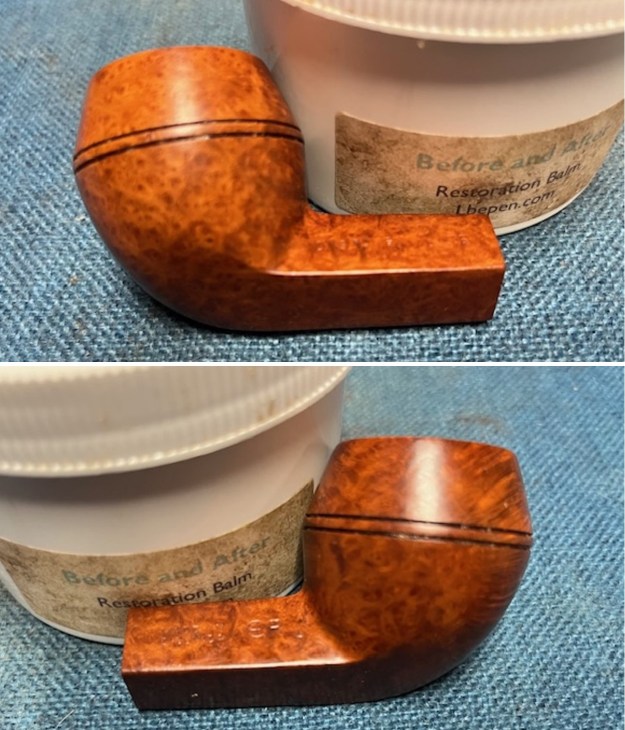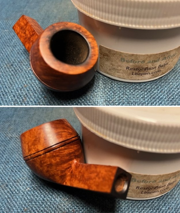 I rubbed the briar down with Before & After Restoration Balm. I worked it into the briar with my fingertips to work it into the finish. The product works to clean, enliven and preserve the briar. I let it sit for 10 minutes then I buffed it with a cotton cloth to deepen the shine. The briar really comes alive with the balm.