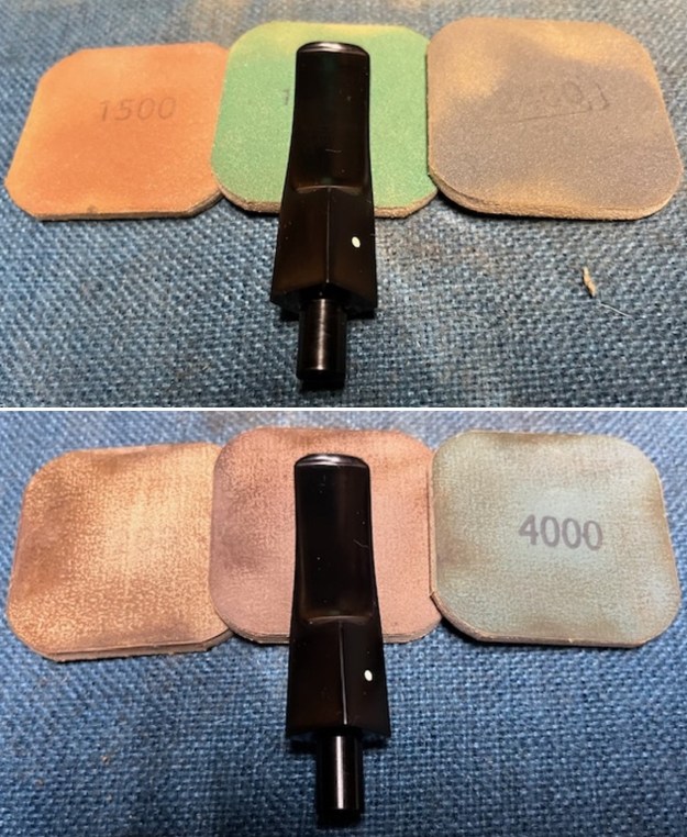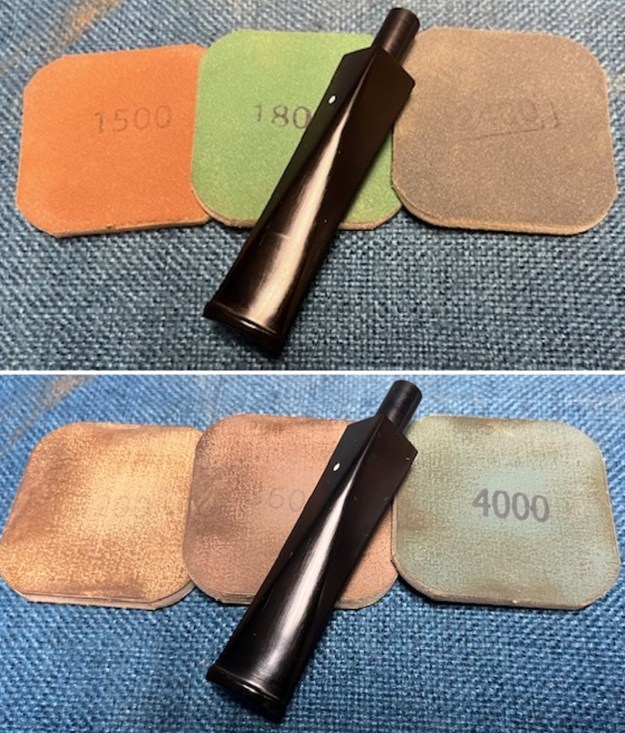 I polished the vulcanite with micromesh sanding pads – 1500-12000 grit pads. I wiped it down with Obsidian Oil after each sanding pad. I used Before & After Pipe Polish – both Fine and Extra Fine to further polish the stem.