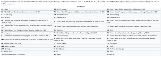 I turned to Pipedia’s shape charts on Dunhills (https://pipedia.org/wiki/Dunhill_Shape_Chart). I have included the shape charts from the site. The first is the chart as a whole and the second is a larger version of the right column.