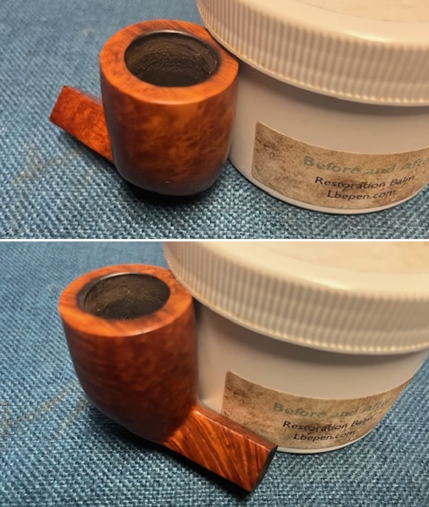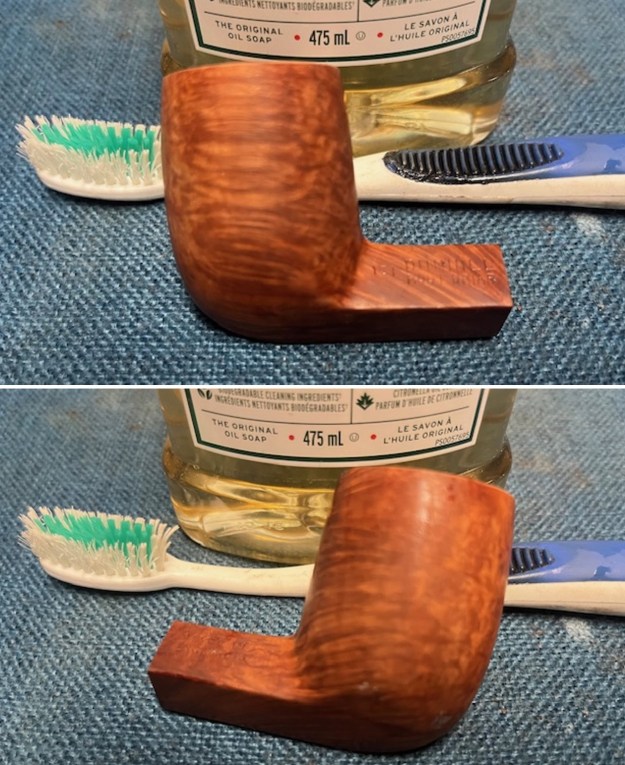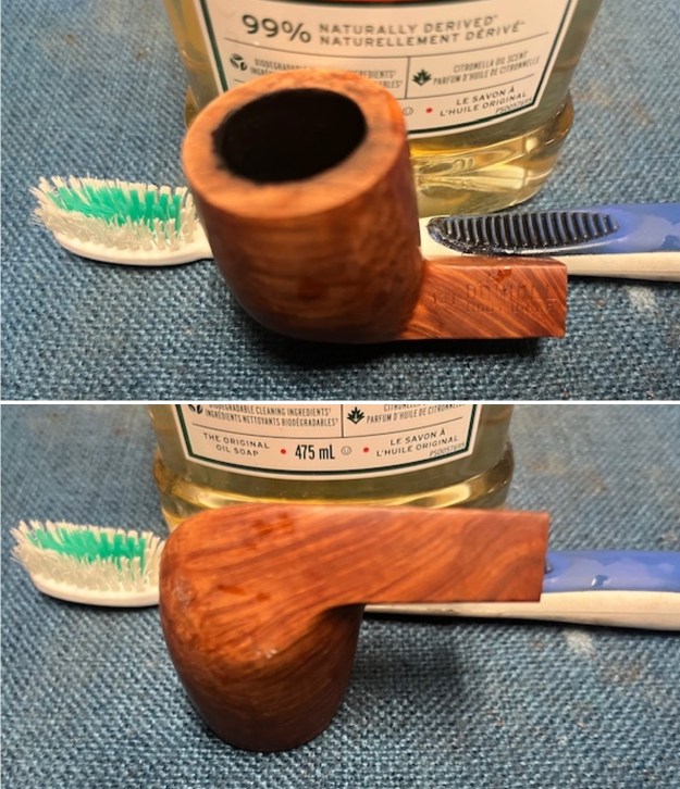 I scrubbed the bowl and shank with a tooth brush and some undiluted Murphy’s Oil Soap. I rinsed it off with warm water to remove the dust and soap from the finish. I dried it off with a soft cloth and it looked much better.