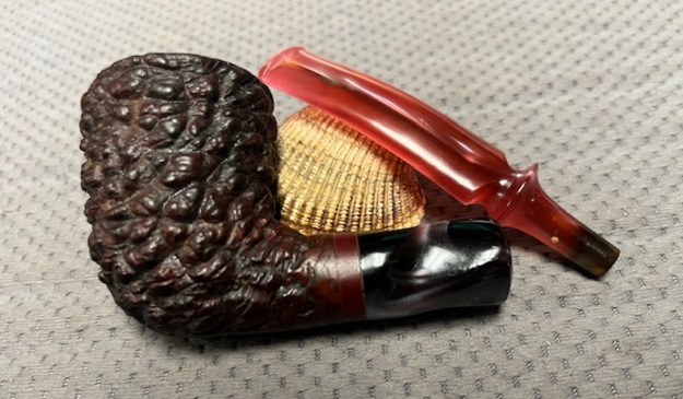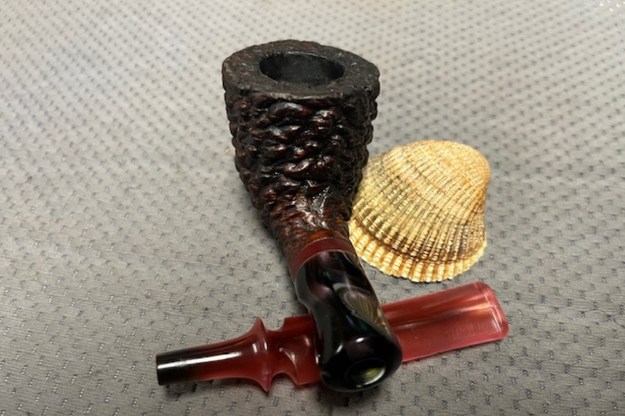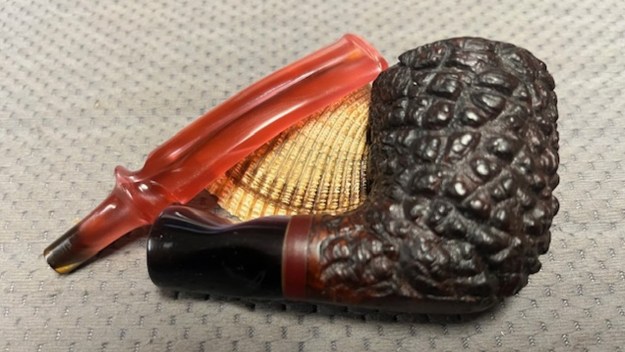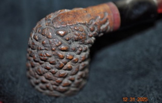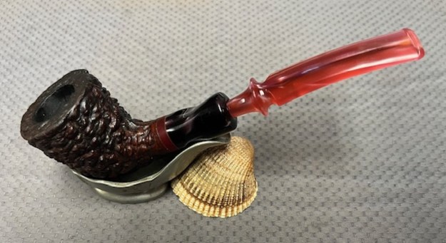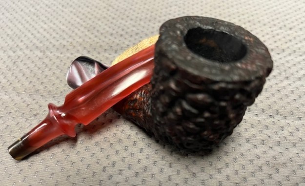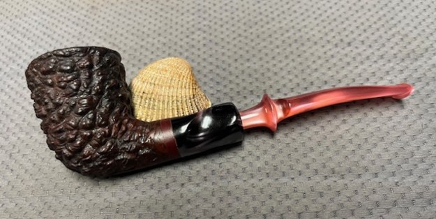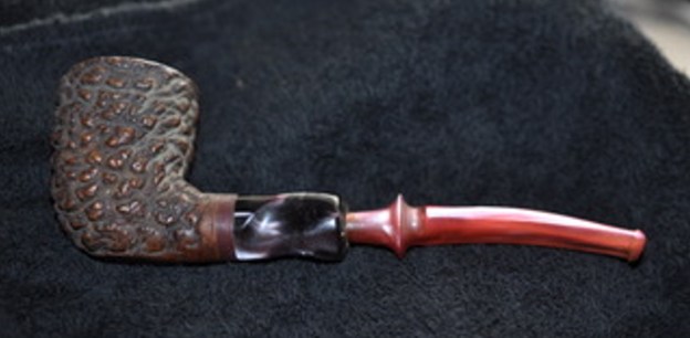 I don’t know what it is about finishing a restoration but I have to tell you that it is my favourite part of the process. It is the moment when everything that I have been working on comes together. I can compare it to where I started and there is always the satisfaction that it does indeed look better than when Jeff and I picked it up. I put the Edwards Algerian Briar Pebble Rusticated Dublin back together and carefully buffed it with Blue Diamond on the buffing wheel. I gave the bowl multiple coats of Conservator’s Wax and the stem multiple coats of carnauba wax. I buffed the pipe with a clean buffing pad and hand buffed it to raise the shine. It is fun to see what the polished uniquely shaped Edward’s Rustication looks like along with the polished fancy rose coloured acrylic stem. This is an interesting Pebble Finish Edwards Dublin and I am sure that it will be comfortable in hand when smoking as it is light and well balanced for a pipe of this size. Have a look at it with the photos below. The dimensions are Length: 6 ½ inches, Height: 2 inches, Outside diameter of the bowl: 1 ½ inches, Chamber diameter: ¾ of an inch. The weight of the pipe is 1.87 ounces/53 grams. Thanks for walking through the restoration with me as I worked over another beautiful pipe. This one will be going on the rebornpipes store in the Pipes from American Pipe Makers Section shortly if you would like to add it to your collection. Thanks for your time.