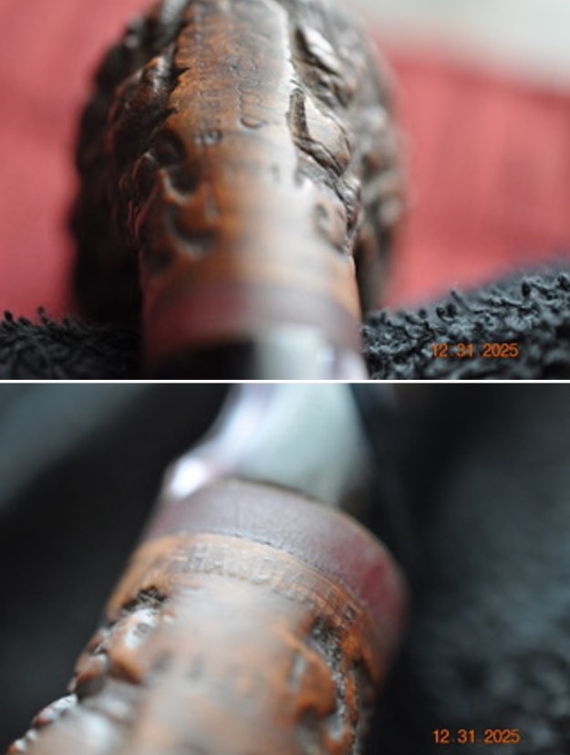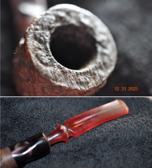 Jeff took photos of the bowl and rim top to show this thick cake in the bowl and heavy lava coat in the rustication of the rim top. Hopefully the cake and lava had protected the inner and out edge of the rim. The photos of the stem show the chatter and tooth marks on both sides.